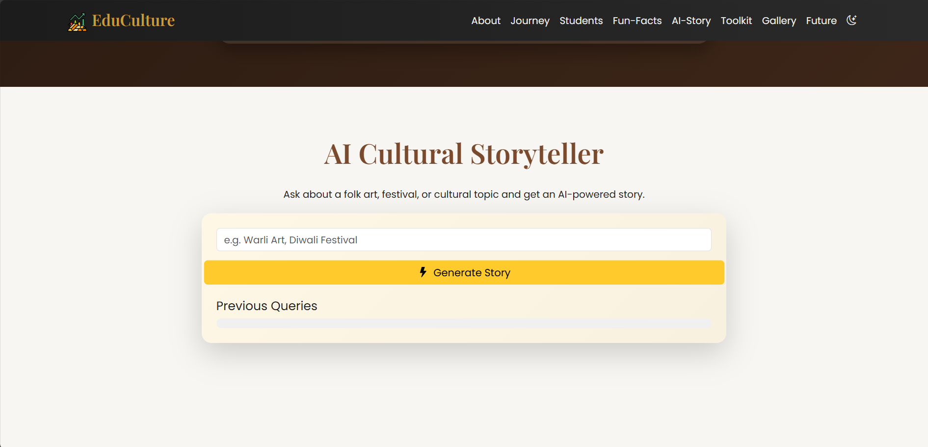 Students often learn about culture, heritage, and traditions through text-heavy books and memorization, which makes the subject feel boring, disconnected, and hard to relate to. In reality, culture is visual, story-driven, and experiential — but traditional learning methods fail to capture that.