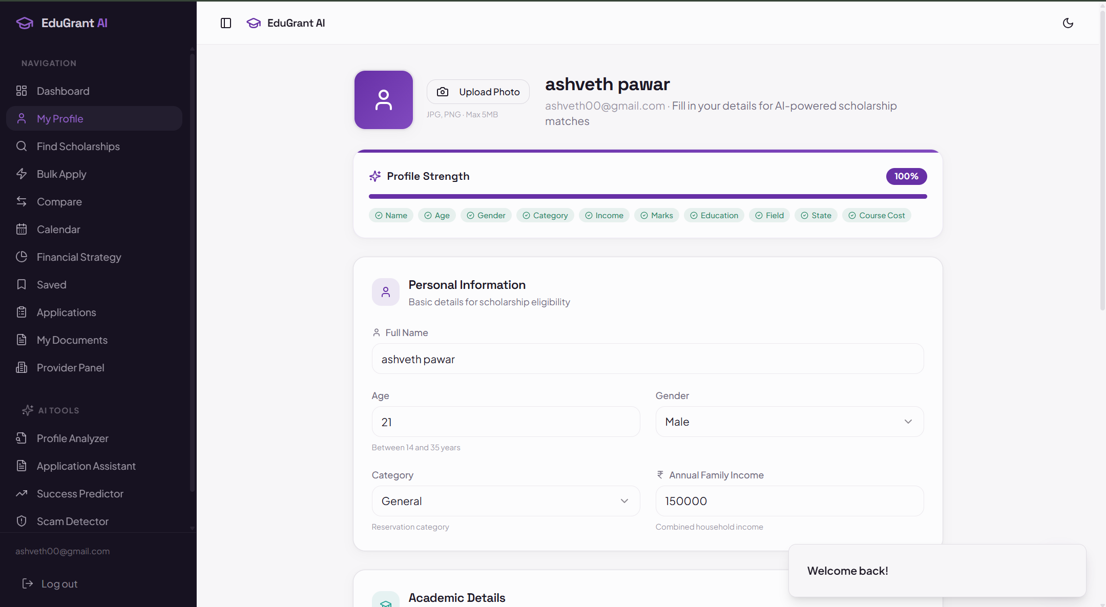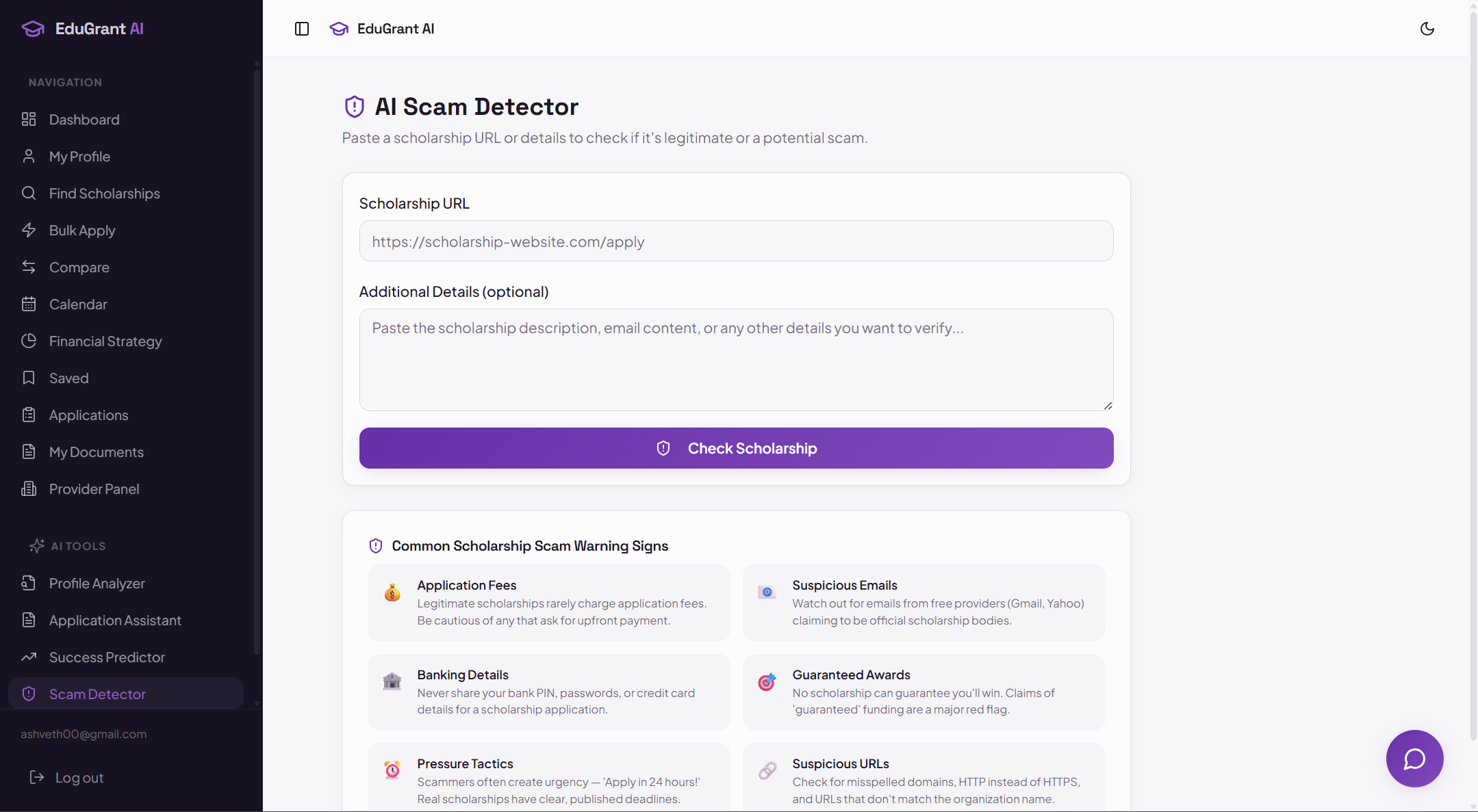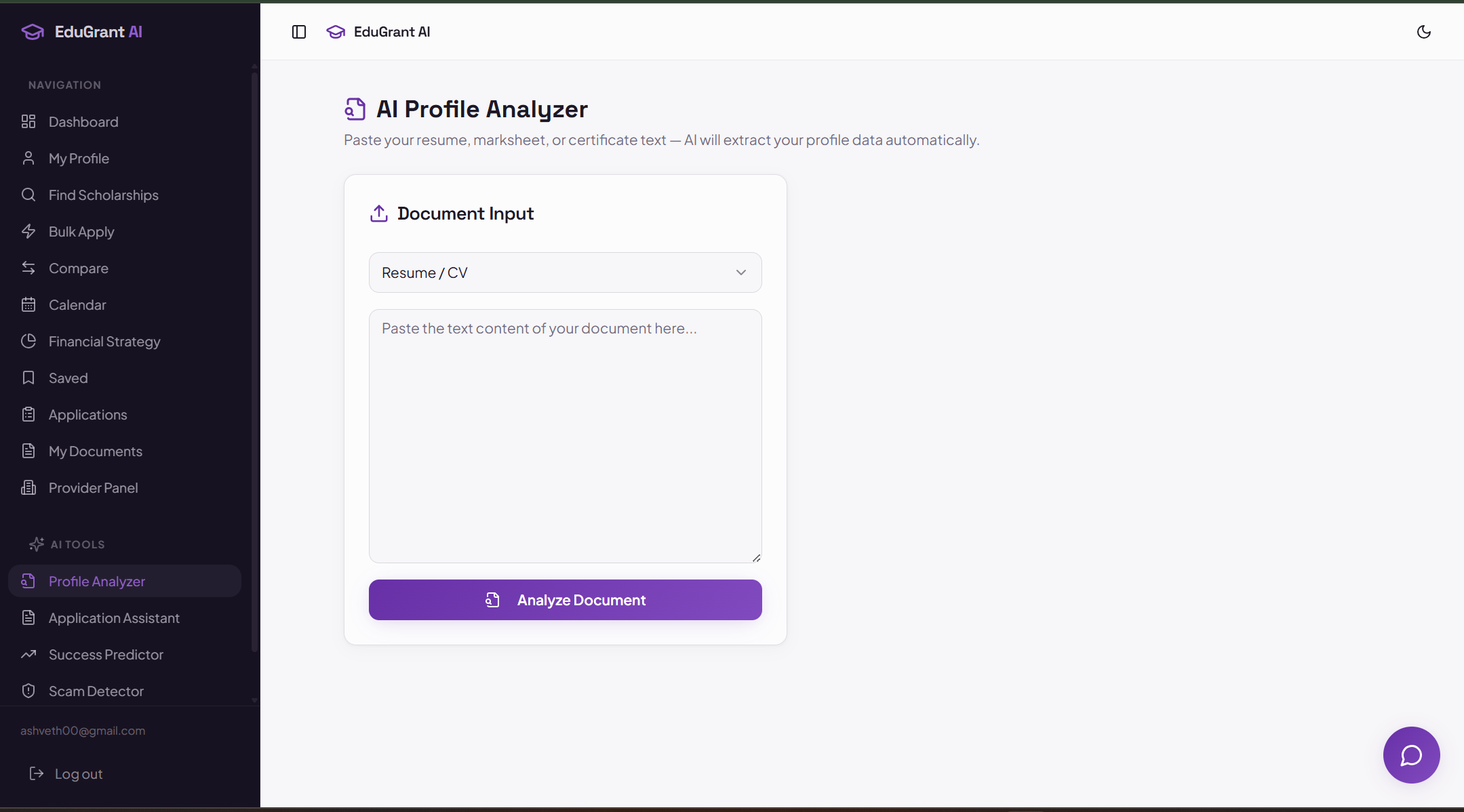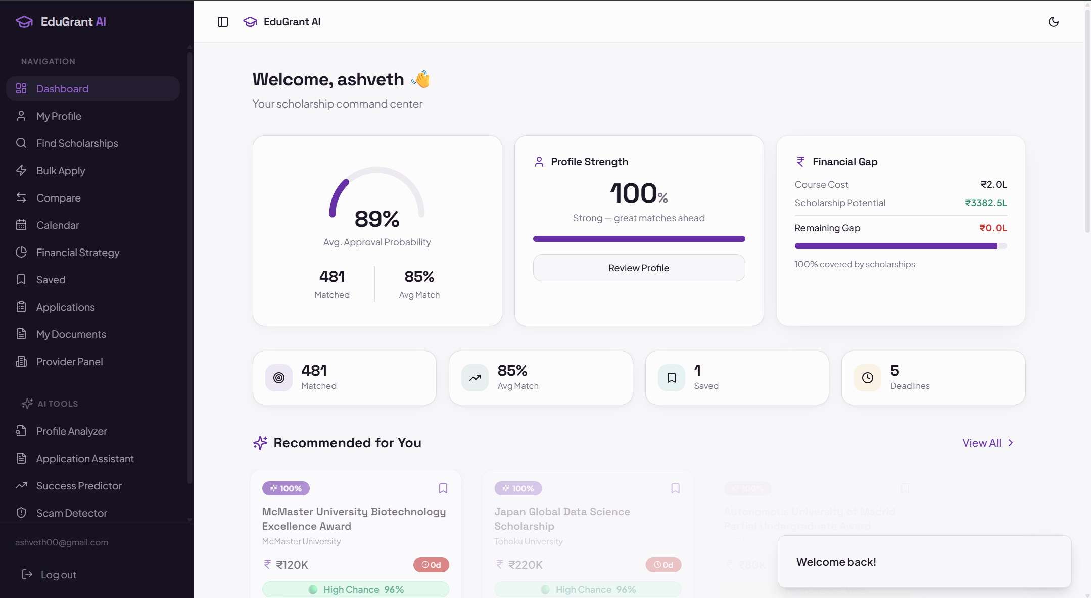 EduGrant AI helps students discover scholarships, grants, and educational opportunities that actually match their profile. Instead of searching endlessly, users just enter their details and get personalized recommendations.