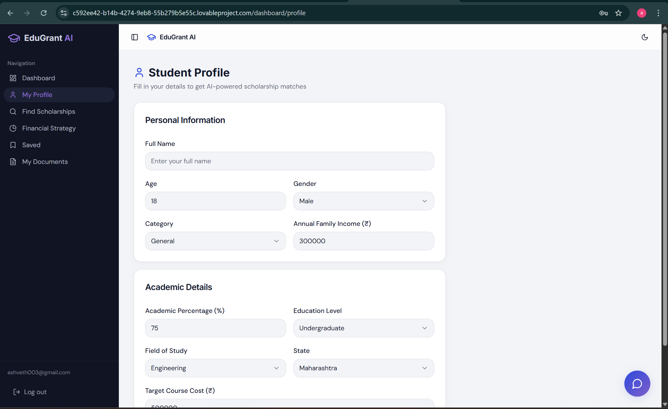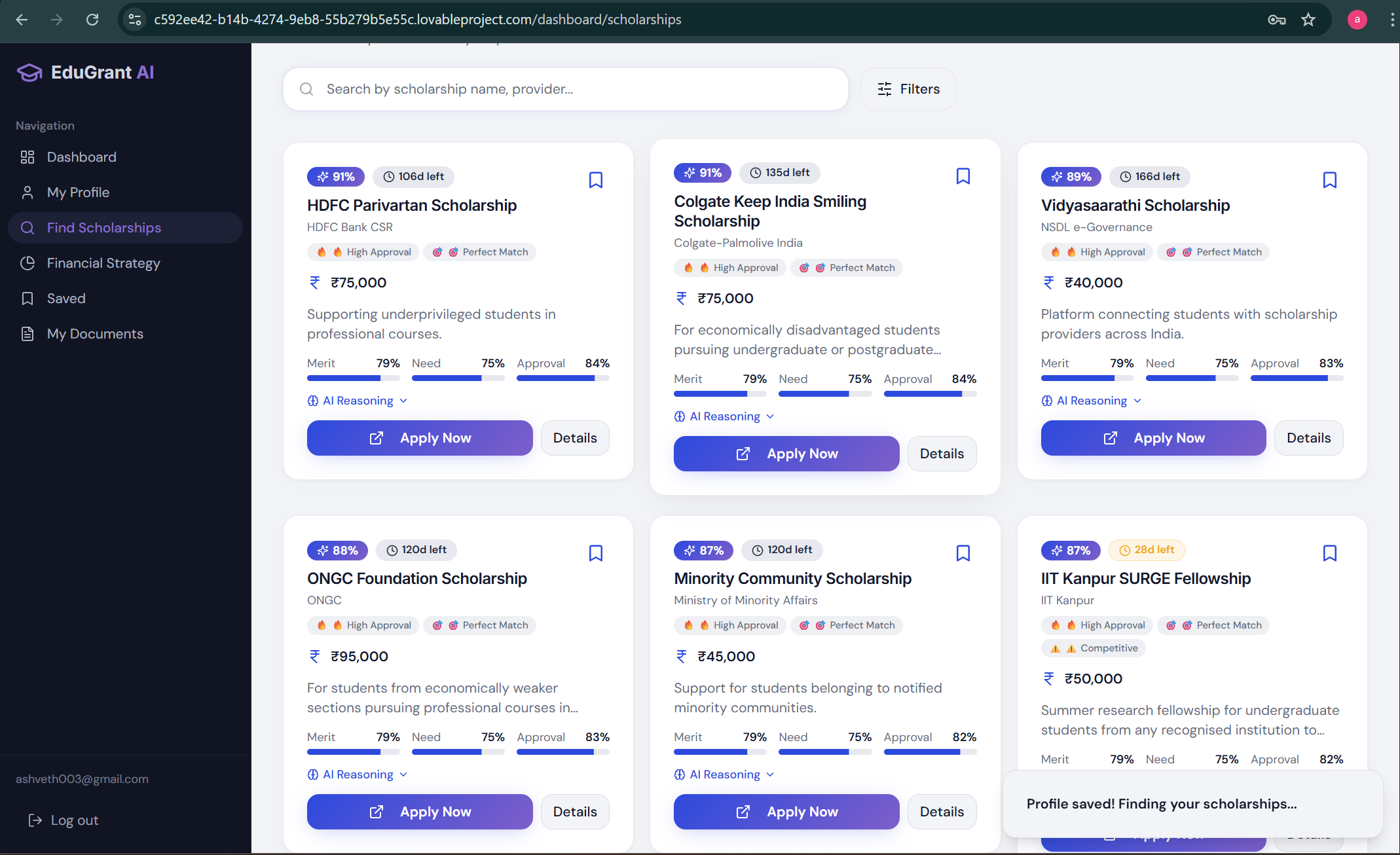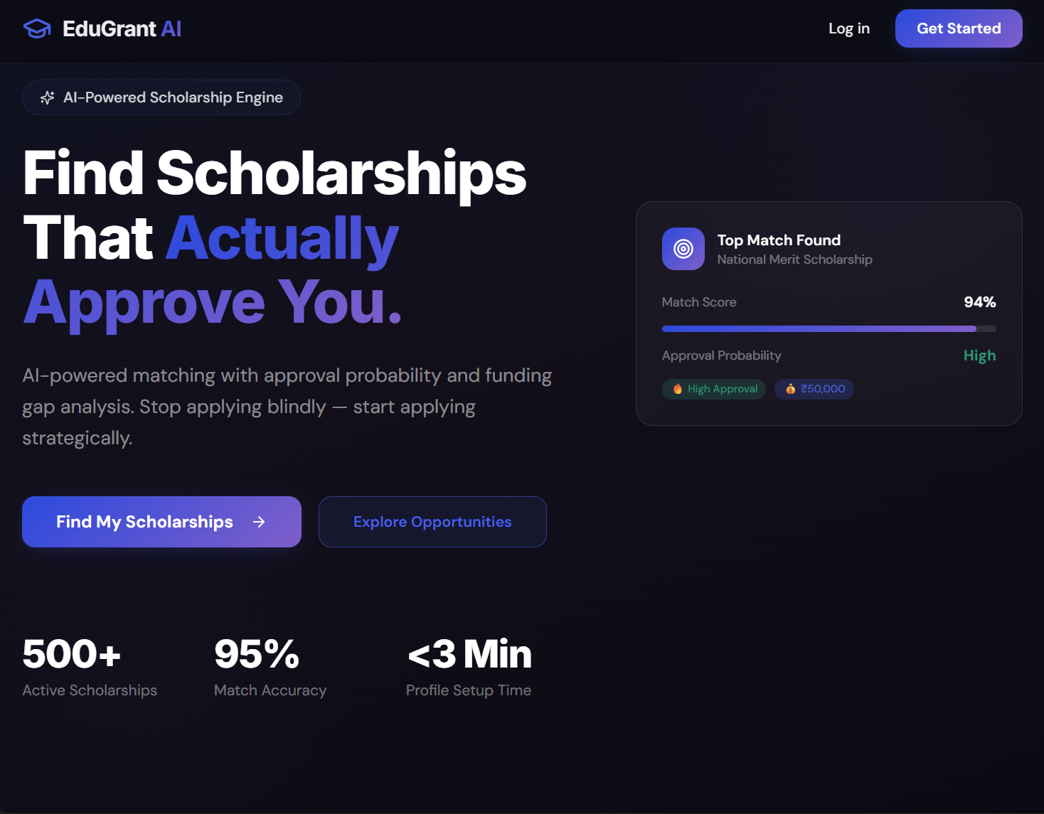 EduGrant AI matches students with scholarships tailored to their profile. After students input their academic, financial, and personal details, the AI analyzes eligibility, approval likelihood, and funding gaps, then ranks the best matches. It not only suggests scholarships but also helps students track deadlines, build stronger applications, and plan their financial strategy.