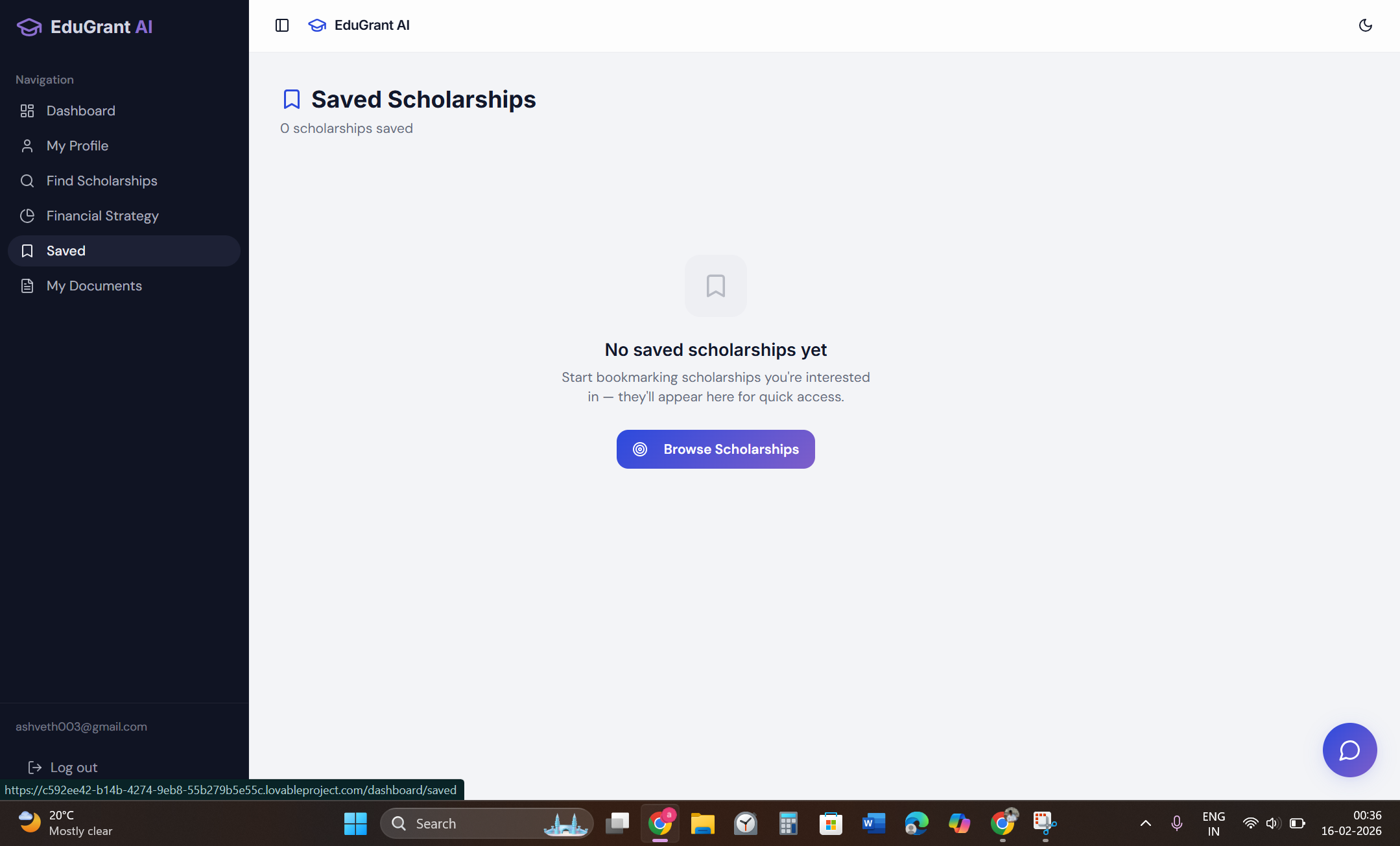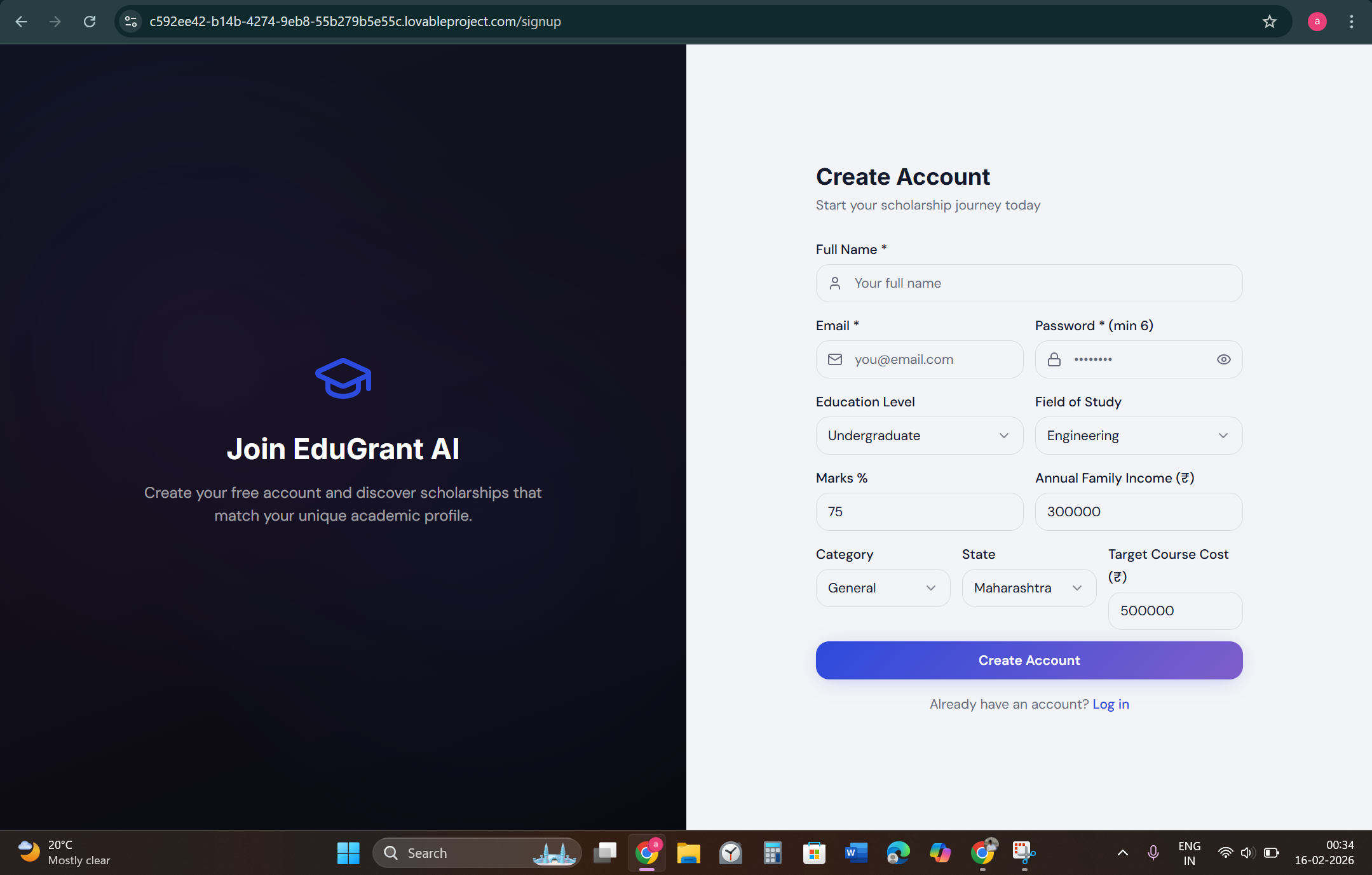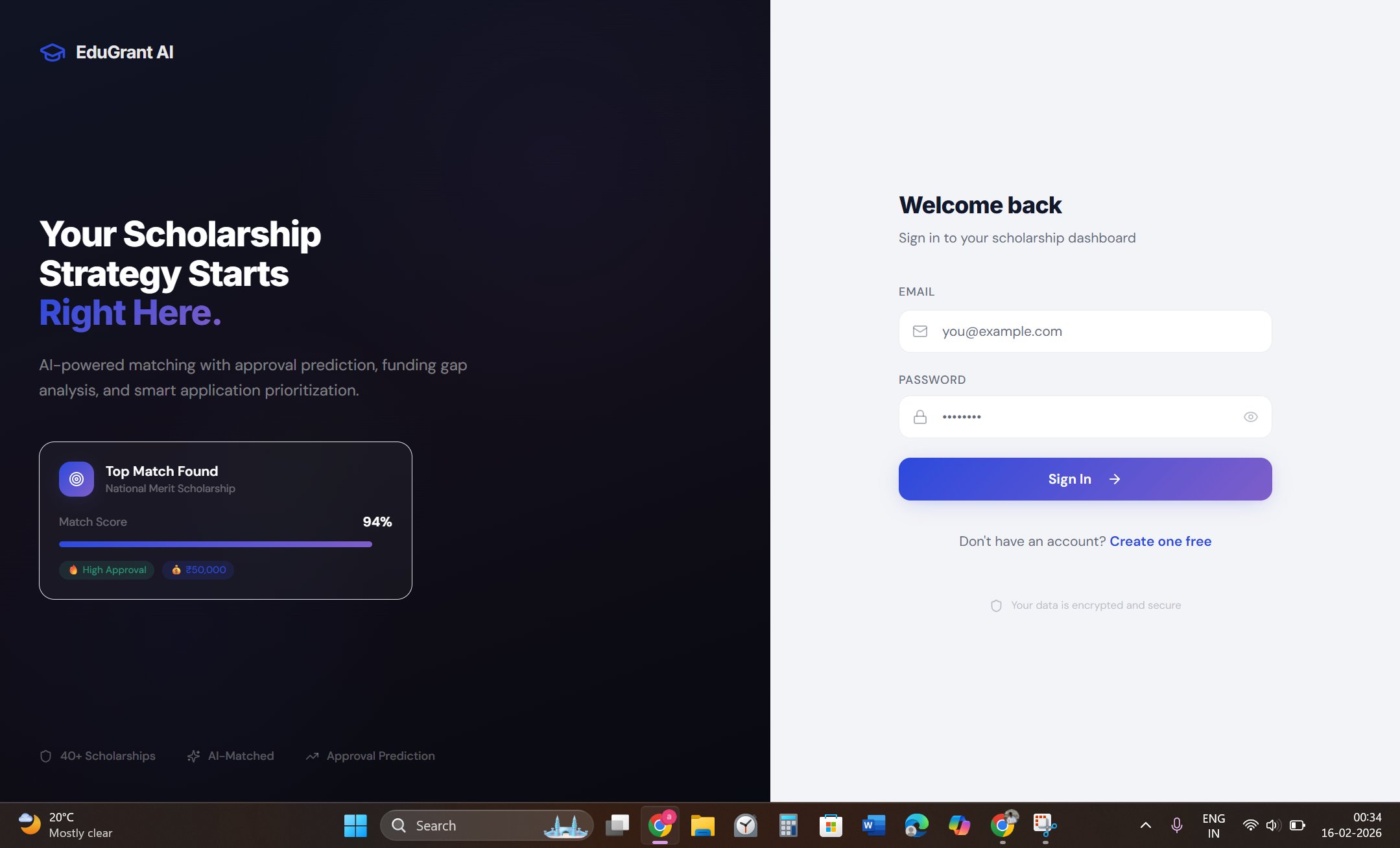 EduGrant AI matches students with scholarships tailored to their profile. After students input their academic, financial, and personal details, the AI analyzes eligibility, approval likelihood, and funding gaps, then ranks the best matches. It not only suggests scholarships but also helps students track deadlines, build stronger applications, and plan their financial strategy.
