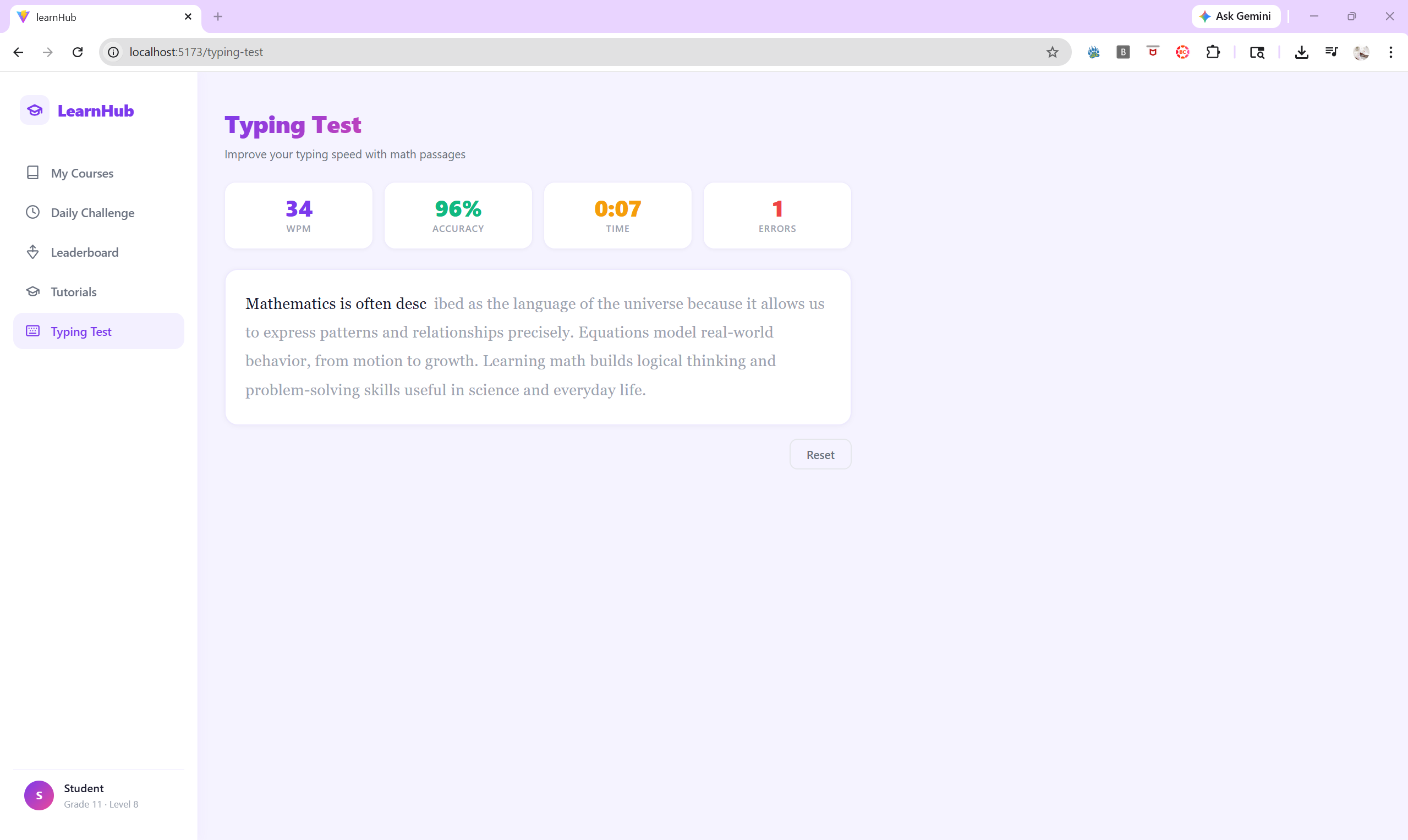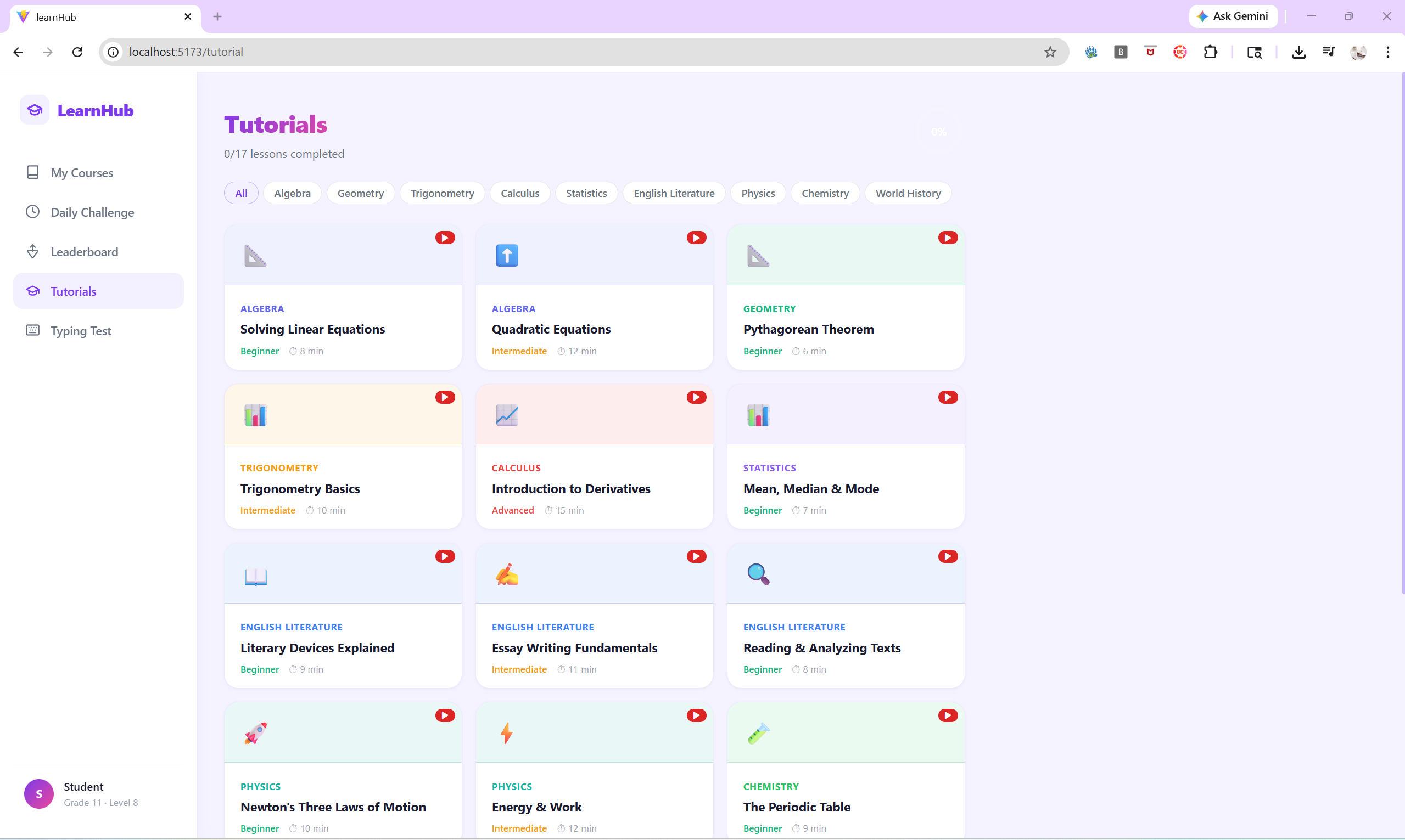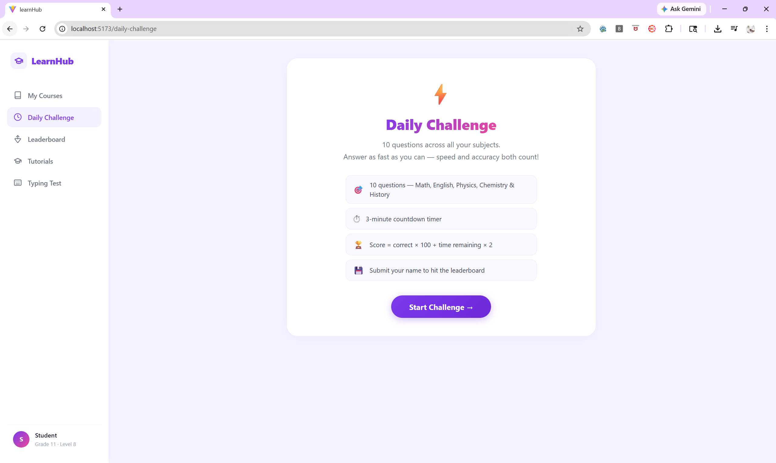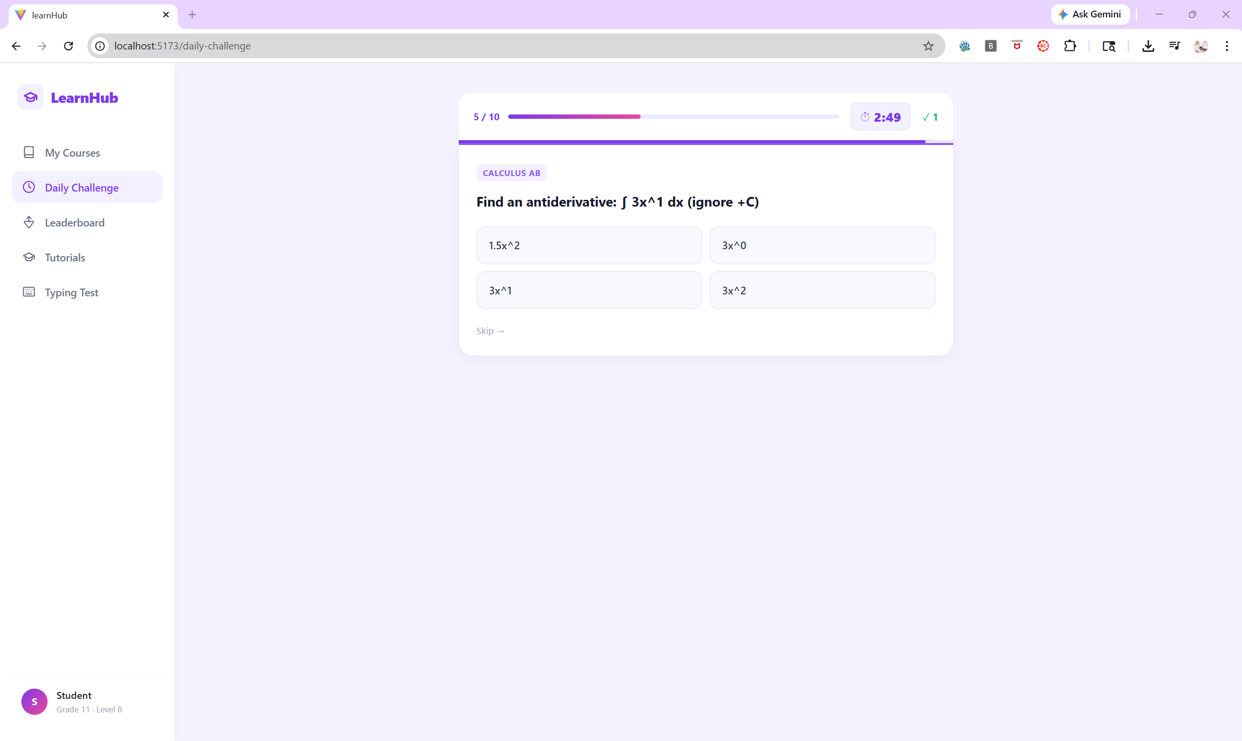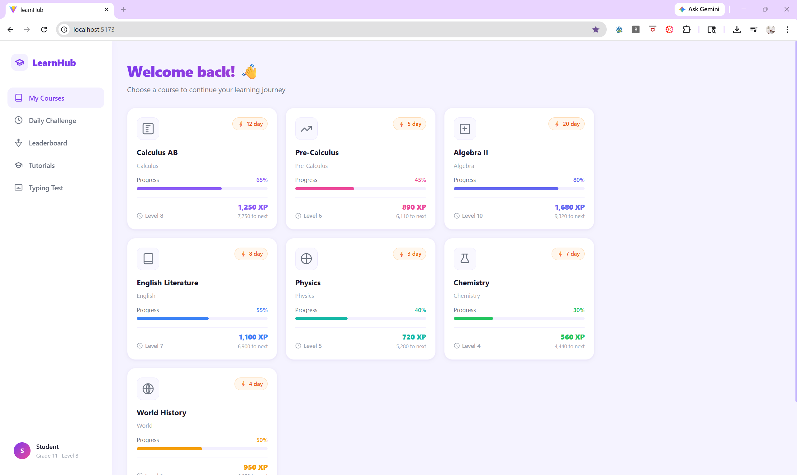 📚 About the Project: LearnHub 💡 Inspiration High school can feel overwhelming—students juggle multiple subjects, fast-paced classes, and constant pressure to perform. I noticed that many students don’t struggle because they can’t learn, but because they lack consistent, engaging ways to practice. I wanted to build something that makes daily skill-building feel quick, fun, and motivating instead of stressful.