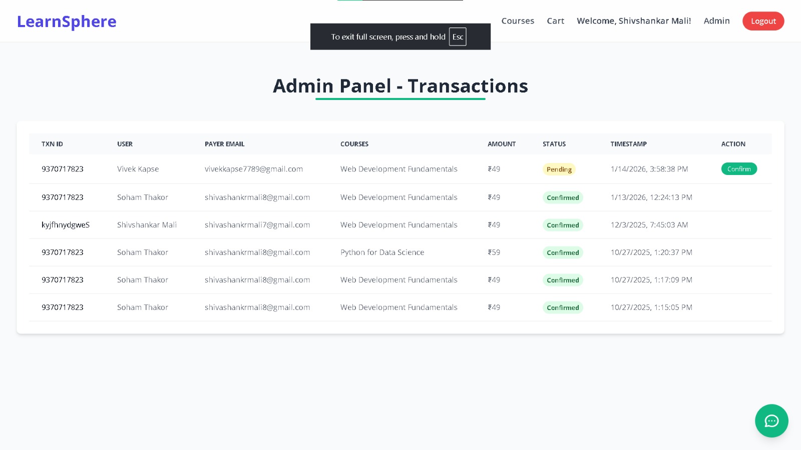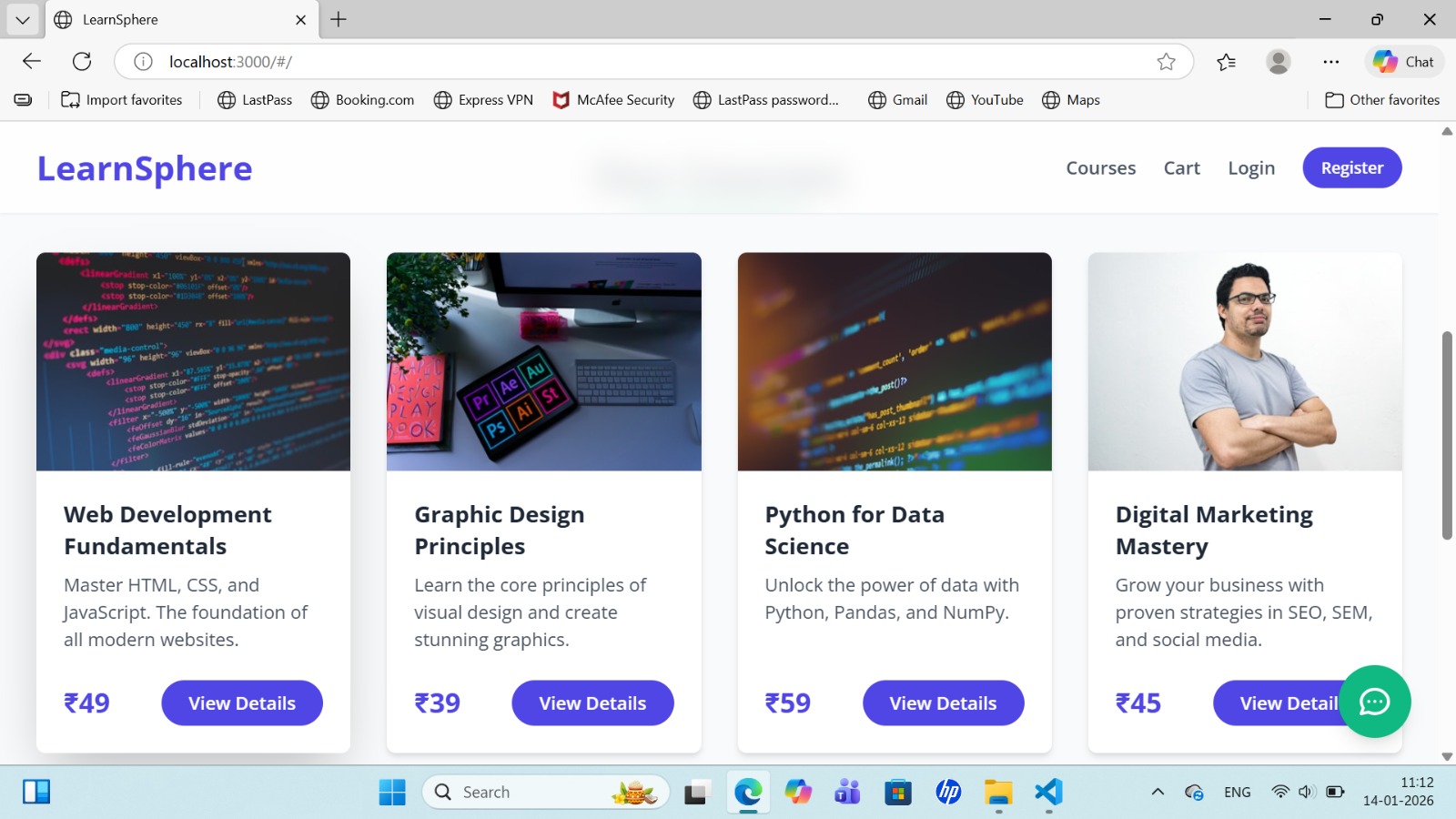 LearnSphere is a prototype course-selling platform where users can browse sample courses, add them to a cart, and receive AI-based course recommendations. The courses and payments are simulated for demonstration purposes, but the overall flow reflects how a real course marketplace would work.