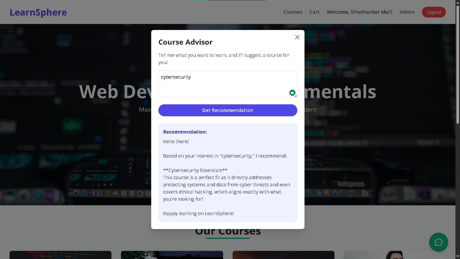 The inspiration for LearnSphere came from observing how confusing it can be for learners to choose the right course online. Many platforms offer hundreds of options, but users still struggle to decide what actually fits their goals. I wanted to explore how a simple AI-powered assistant could help guide users during the course selection process while keeping the platform itself easy to understand.