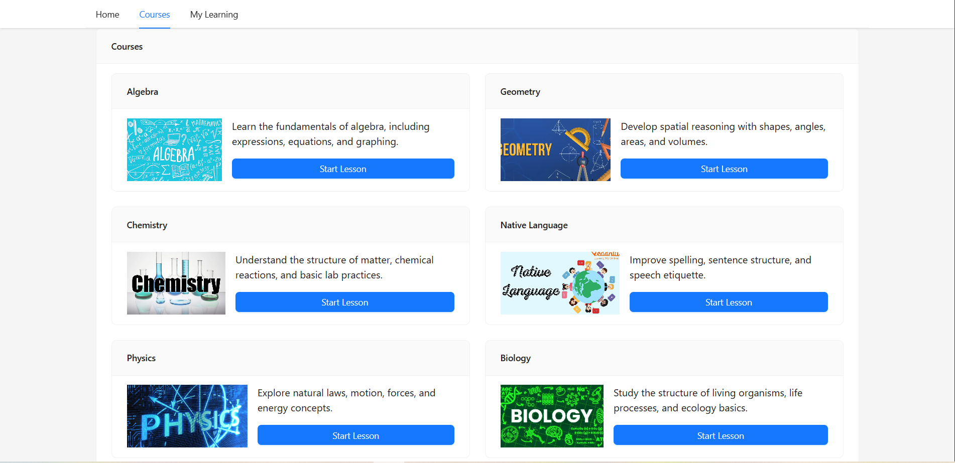 - Course pages with a structured lesson list