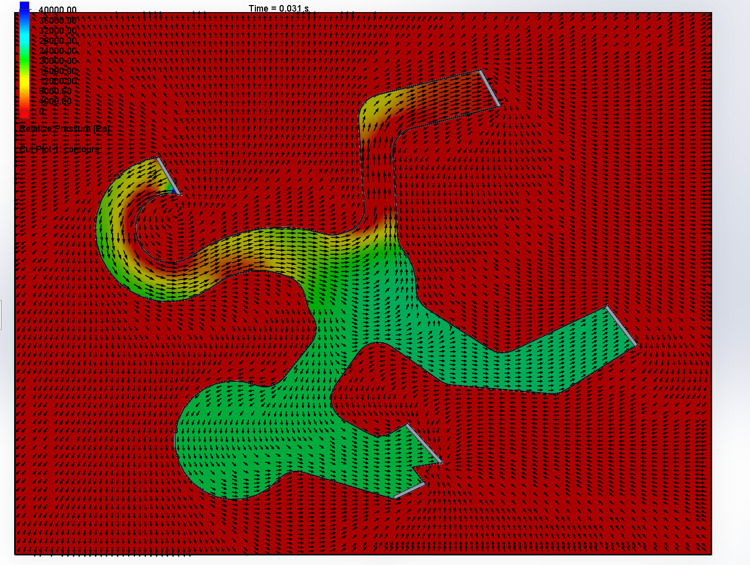 The simulated environment was not constructed through a single continuous workflow but rather we opted to do in various stages in separate programs and file transfers. Firstly, a geometry that was modeled after a branching river was constructed and we ran computational fluid dynamics to determine vector fields, flows, and various pressures. Using a simple approximation for diffusion of an analyte, we then created a rudimentary concentration map across the model. This information was compressed into image form with various colors mapping to particle values of concentration, which could then be imported and subsequently processed via our code. This would enable us to test out various search methods to get simulated drones to the source environment (we did not have much time for the distribution aspect of the algorithm unfortunately).