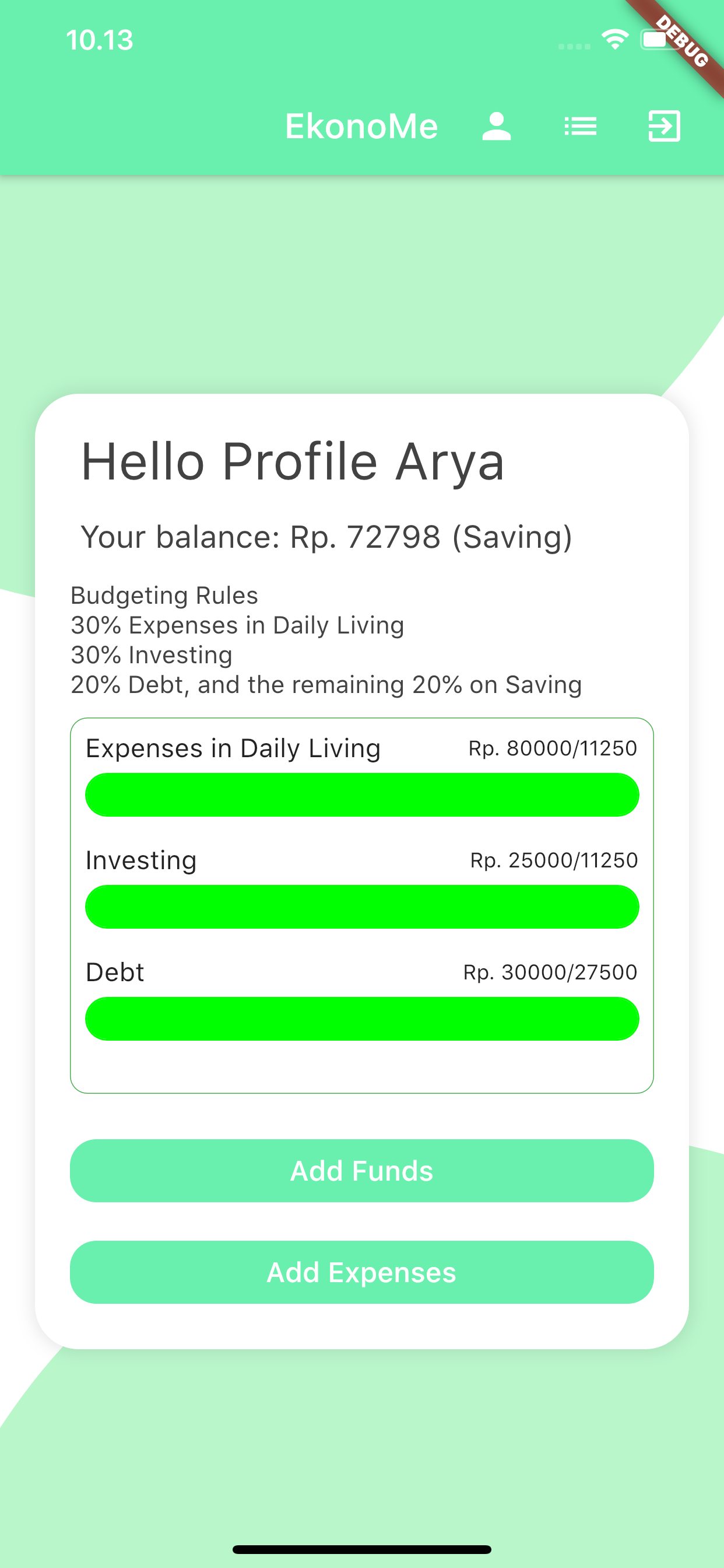 Pencapaian kami adalah aplikasi yang dibuat setidaknya dapat bermanfaat dan membantu anggota tim dalam mengelola keuangannya, selain itu pencapaian lainnya adalah menyelesaikan pembuatan aplikasi secara tepat waktu walaupun masing-masing anggota dari tim memiliki kesibukan masing-masin dan mampu bekerja sama dengan baik walaupun harus bertemu secara online.