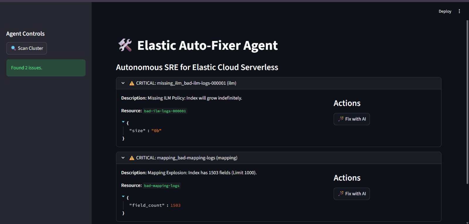 Continuously scans clusters for performance anti-patterns, diagnoses root causes with _profile APIs, generates optimized DSL fixes via Elastic Inference API (or offline rules), validates result equivalence, benchmarks improvements (60-98% faster), and deploys safely. Self-healing infrastructure.