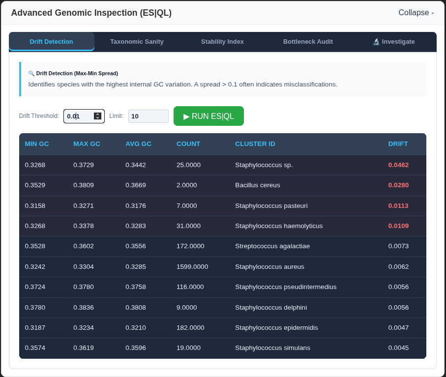 - Advanced Genomic Auditing (ES|QL): A deep-inspection suite using Elasticsearch Query Language to detect genetic bottlenecks, calculate taxonomic sanity, and identify high-variance outliers across the entire database.