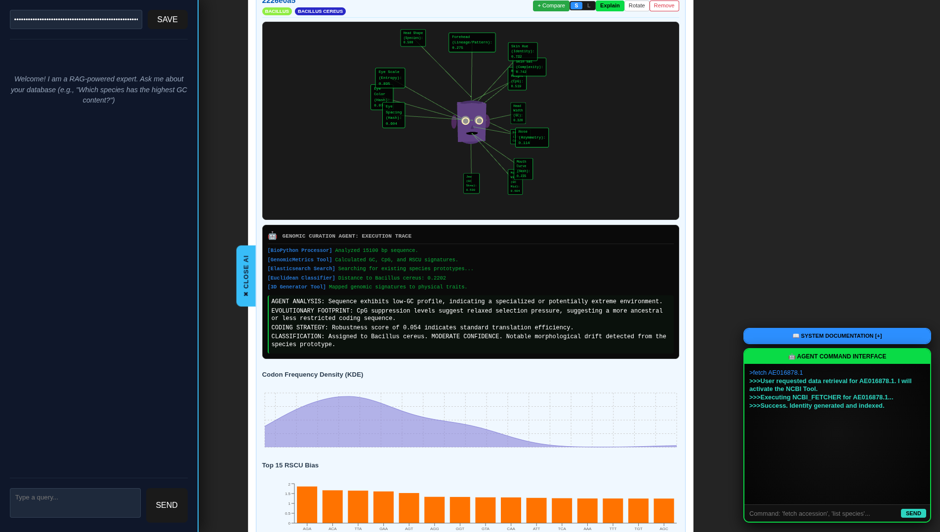 I'm proud of the Novel 3D Genomic Identity, the Novel 3D Classification Engine and the "Novel 3D Genomic Galaxy". Seeing a 3D Facial Genome landing in the 3D Galaxy and immediately starts pulsing based on its mathematical distance to a cluster was a "eureka" moment. I also successfully implemented a multi-step AI Agent that acts. The agent autonomously coordinates fetching, analyzing, and re-classifying data, providing a full execution trace that makes complex bioinformatics accessible to anyone. I'm also proud of the Phylogenetic Blending engine that enables a 3D genomic face to physically "morph" as it moves between evolutionary clusters.