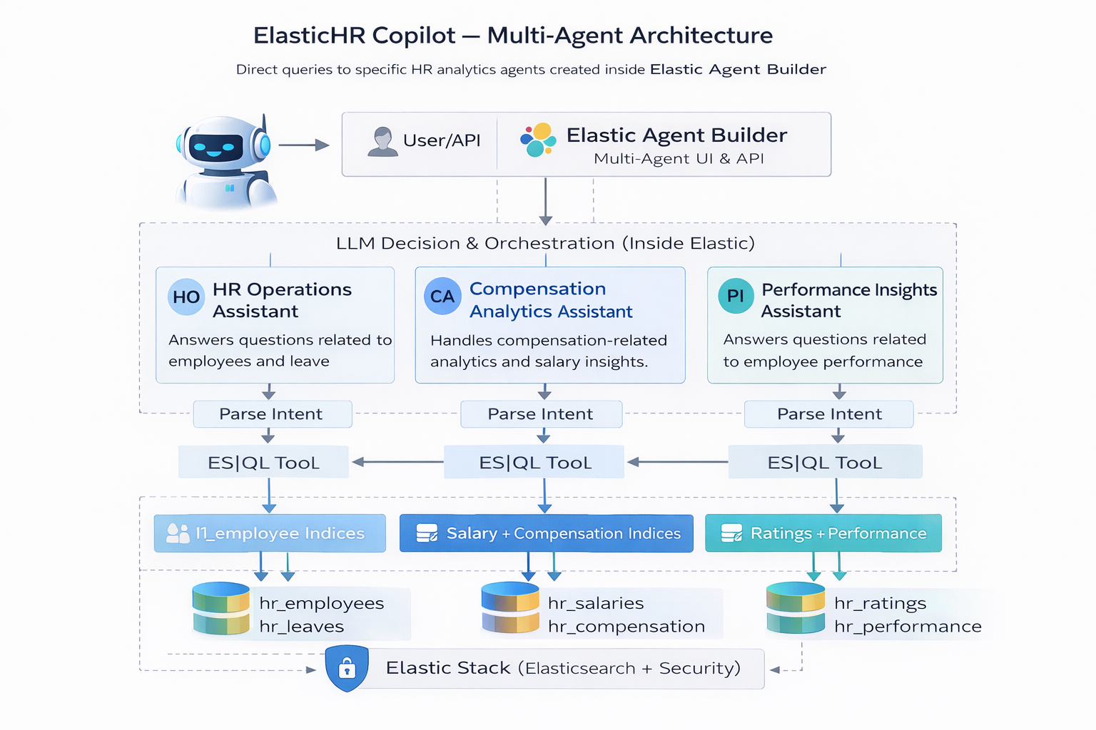 The system operates across three specialized domain agents: HR Insights Agent, Performance Intelligence Agent, and Compensation Analytics Agent. Each agent is restricted to specific Elastic indices, ensuring clear separation of concerns and controlled data exposure.