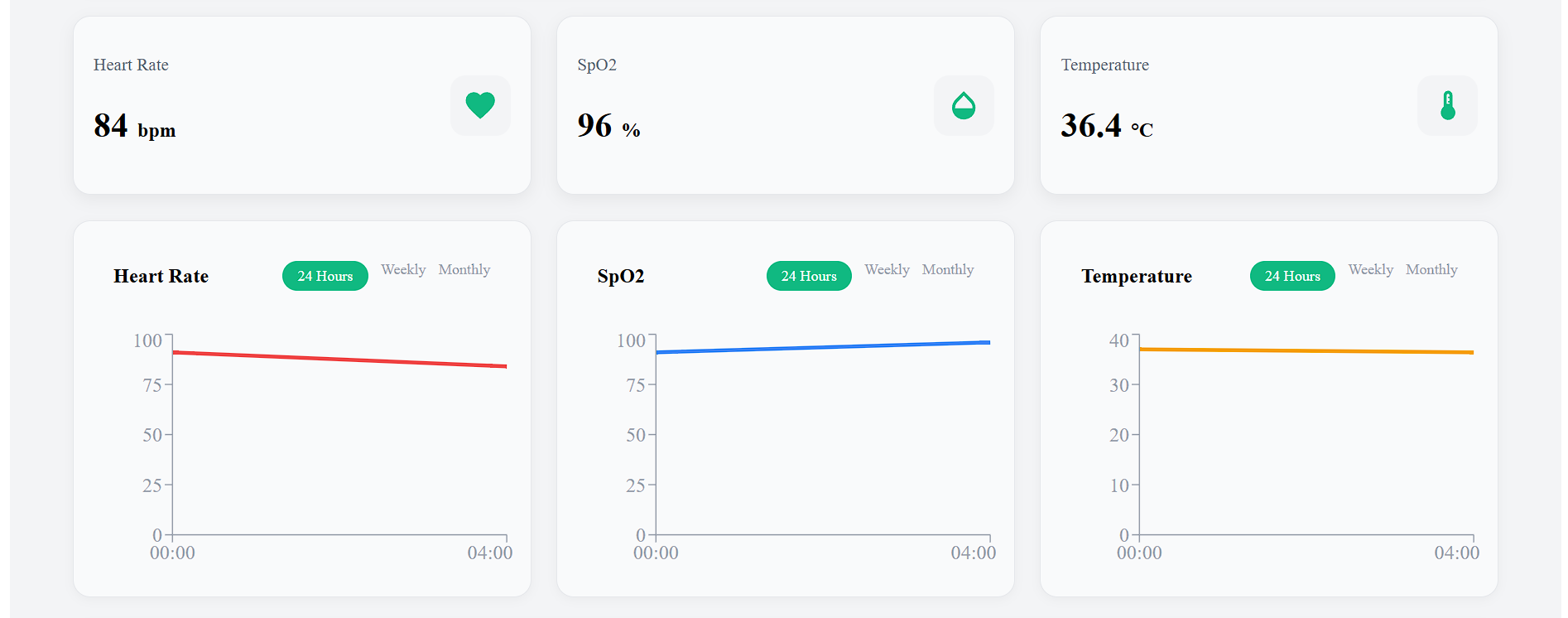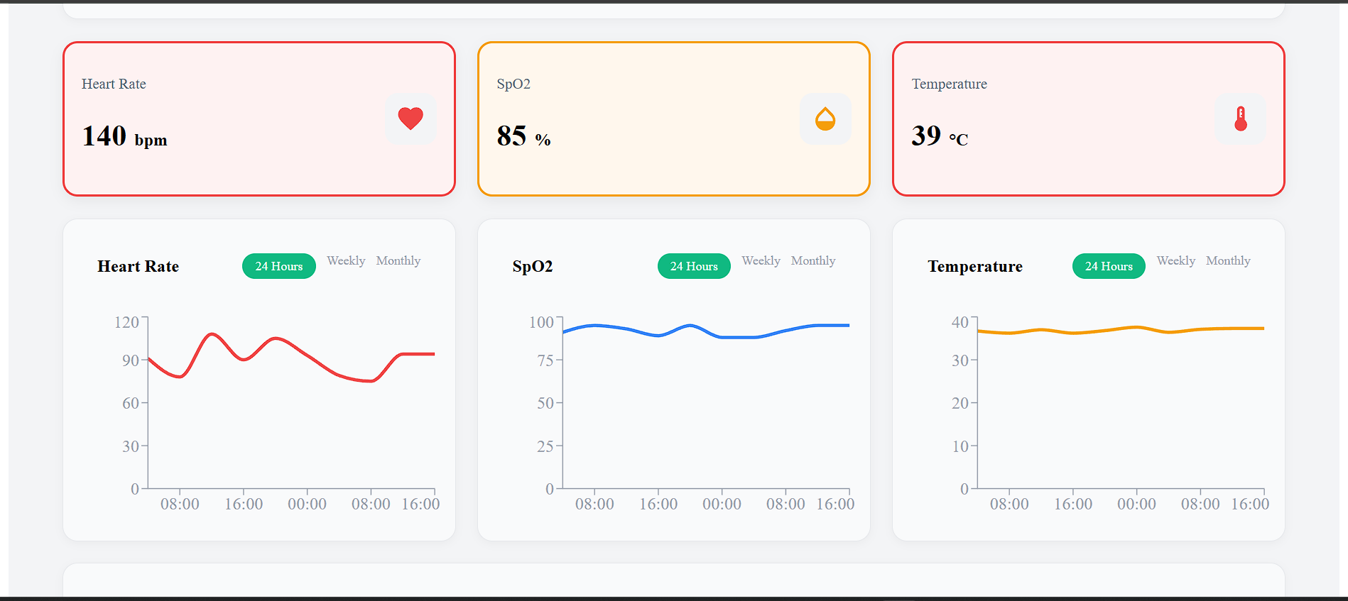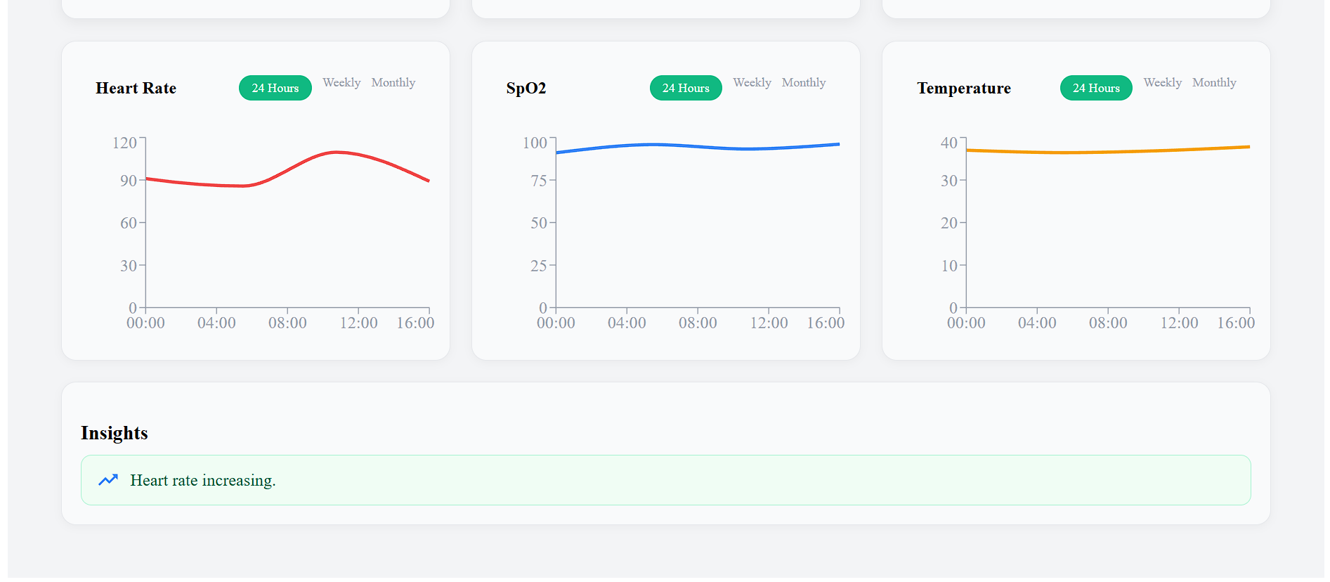 - Simulates IoT-based vital data (heart rate, SpO₂, temperature)
