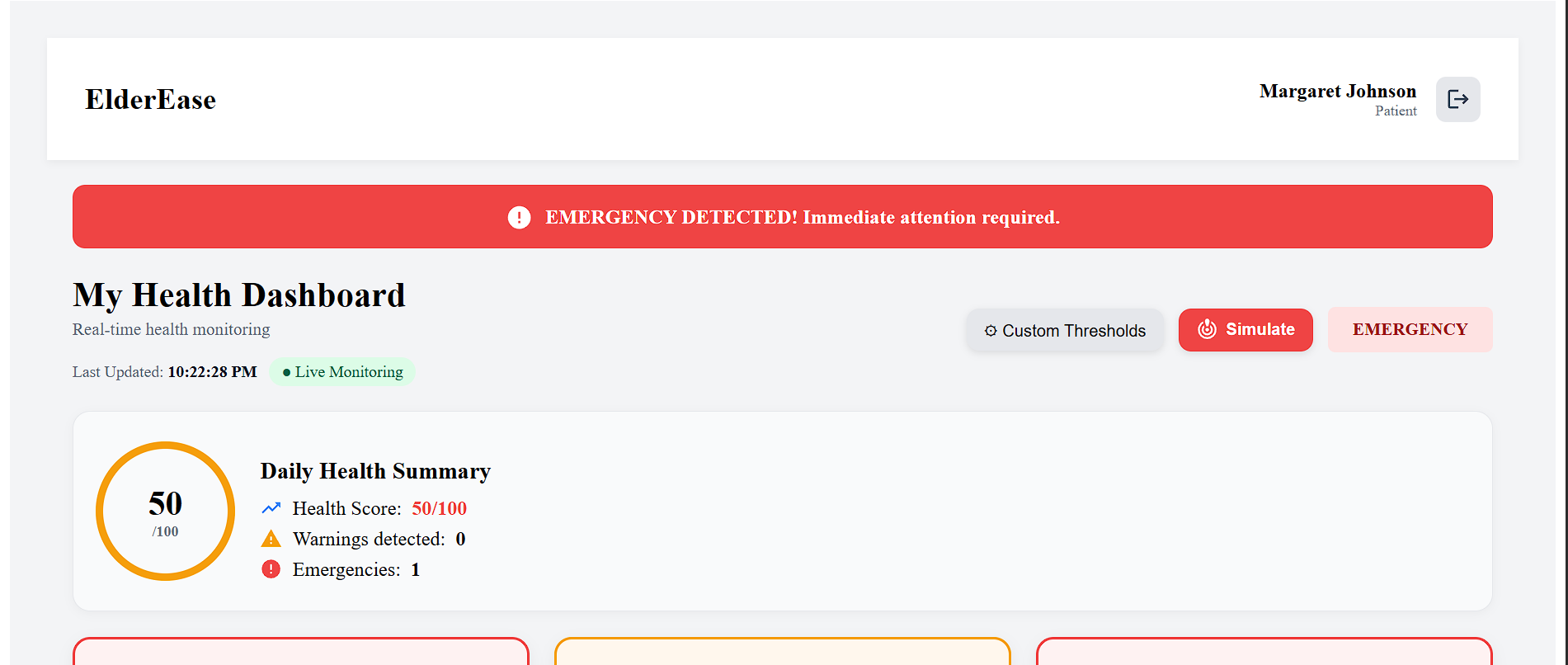 With the growing elderly population, many individuals live alone without continuous medical supervision. Delayed detection of health issues such as low oxygen levels or high heart rate can lead to serious consequences. We wanted to build a system that enables real-time monitoring and early intervention to improve elderly safety and independence.