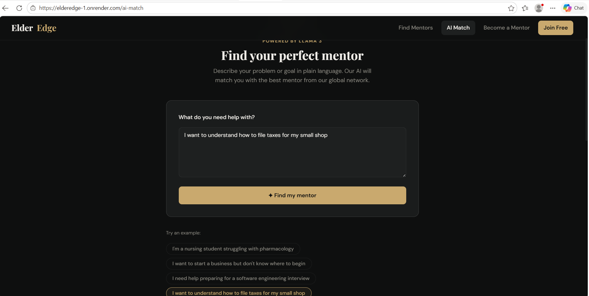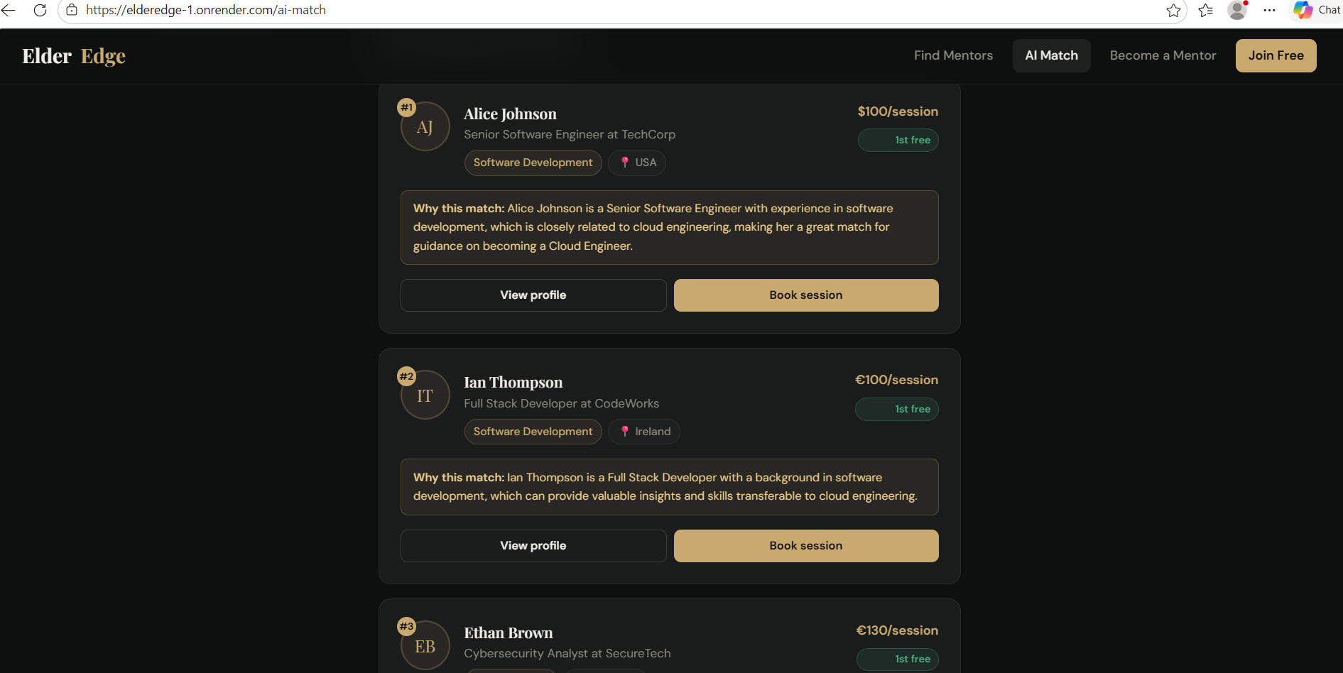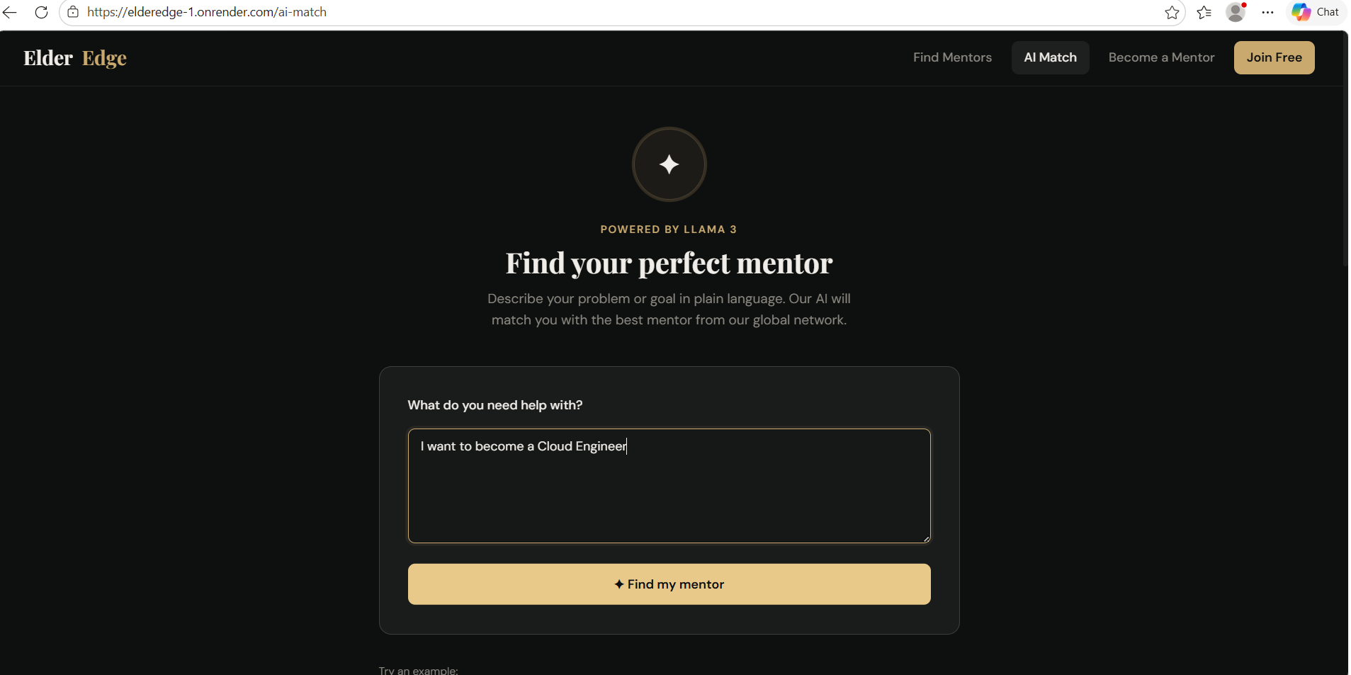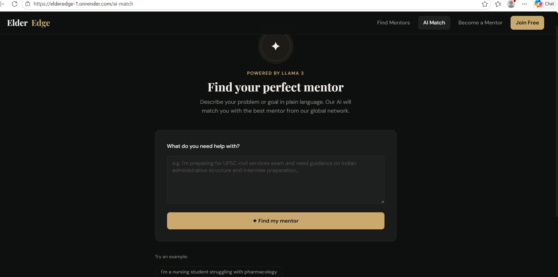 - AI-powered matching — Mentee describes their problem in plain language → Llama 3.3 70B ranks the top 3 mentors with personalised reasons