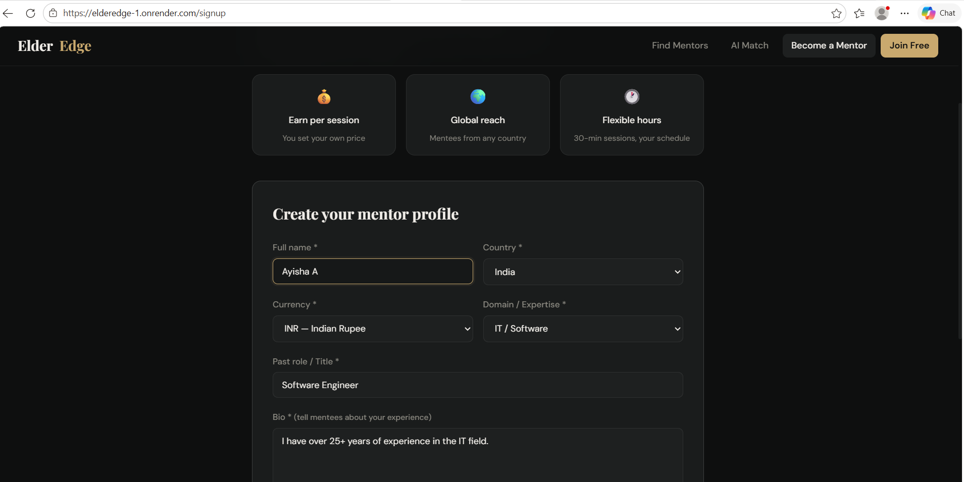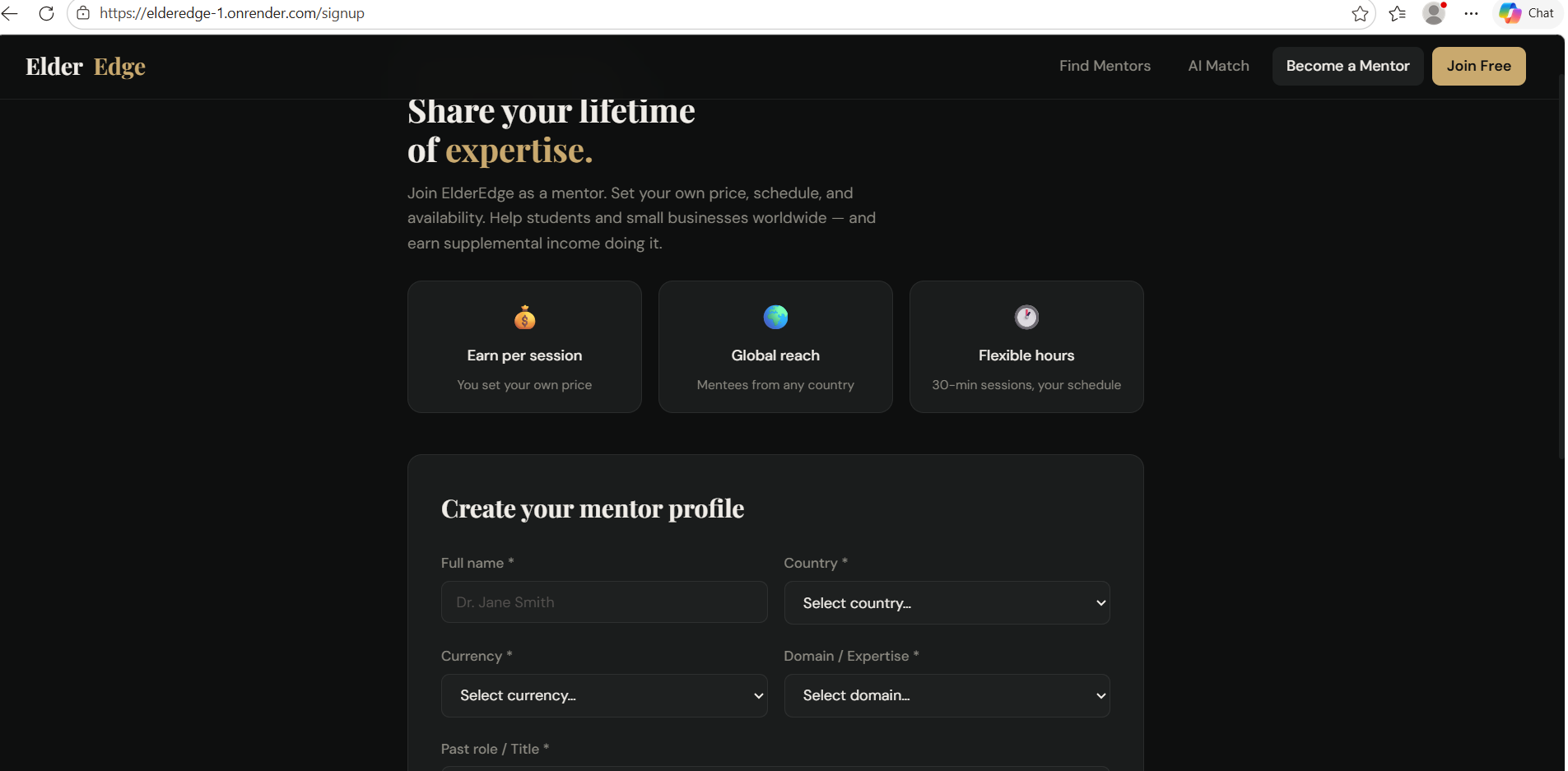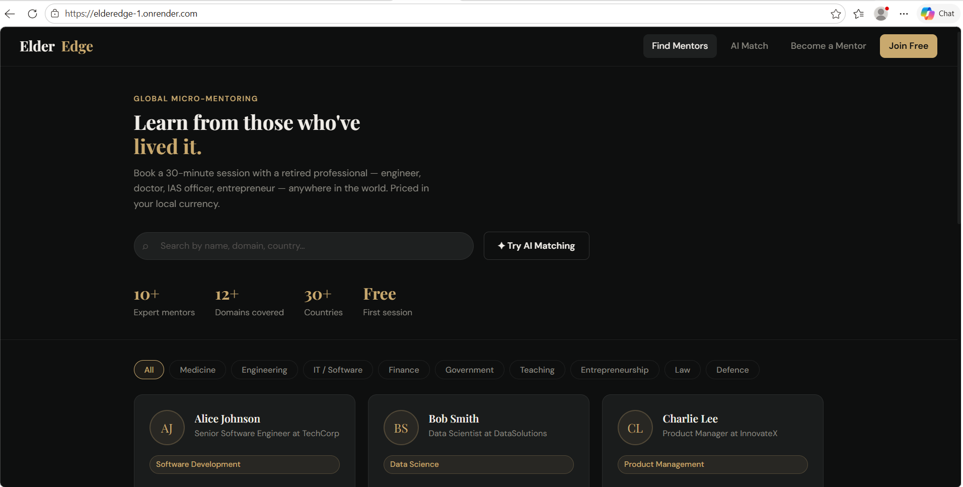 ElderEdge is a global micro-mentoring platform where retired professionals share their expertise through affordable 30-minute sessions.