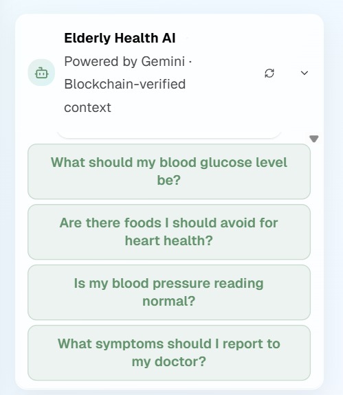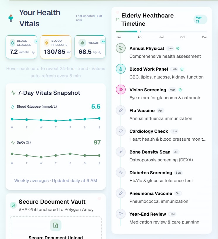 - Predictive Modeling Health Risk Prediction - Machine learning models predict potential health risks based on vitals trends. A. Blood Glucose Prediction Algorithm: LSTM (Long Short-Term Memory) Neural Network B. Blood Pressure Trend Analysis Algorithm: Time Series Forecasting (ARIMA + Neural Network) C. Weight Change Prediction Algorithm: Gradient Boosting (XGBoost) 5.Anomaly Detection Identifies unusual patterns in vitals that may indicate health issues. Detection Methods: Isolation Forest for outlier detection Statistical process control (SPC) charts Multivariate analysis across vitals Temporal pattern recognition 6.Computer Vision Medical Document Analysis - Computer vision models process and extract information from medical documents. ## Challenges we ran into Integration of BioBERT was a bit challenging but we accomplished it. ## Accomplishments that we're proud of Comprehensive AI Integration for Elderly Care: Successfully integrated AI technologies (LLMs, NLP, Computer Vision, Predictive ML, Recommendation Systems) into a cohesive platform specifically designed for elderly patients.