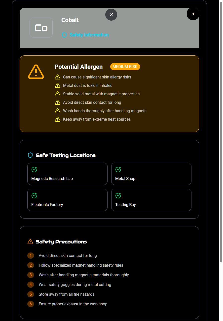 We successfully integrated specialized datasets regarding the Environmental and Health Impact of elements. Our tool doesn't just show what a chemical is, but also how it affects our world and our bodies.