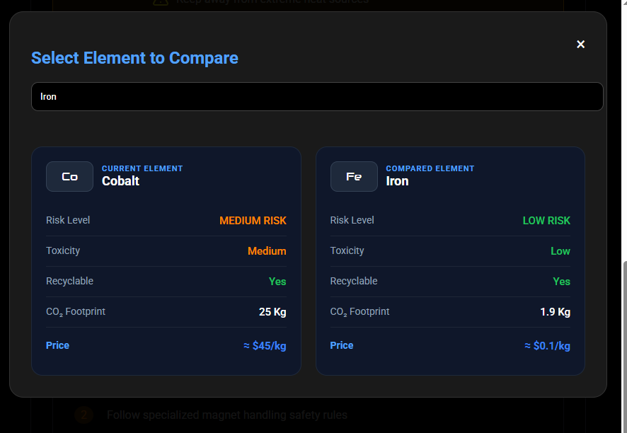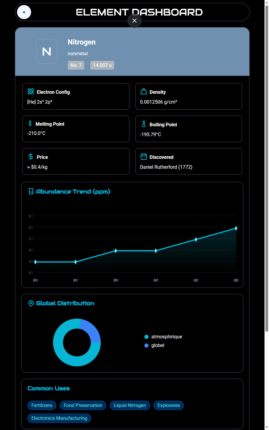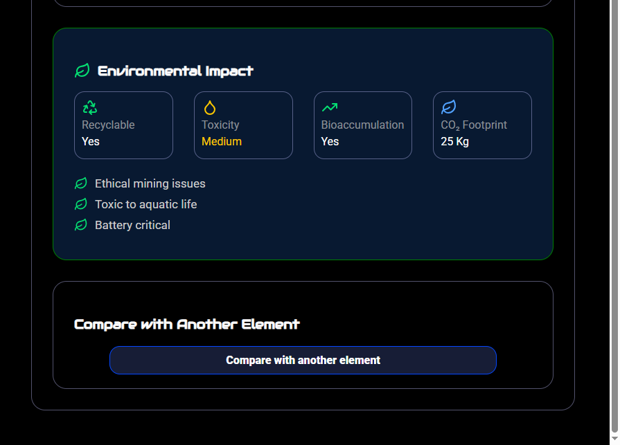 We successfully integrated specialized datasets regarding the Environmental and Health Impact of elements. Our tool doesn't just show what a chemical is, but also how it affects our world and our bodies.