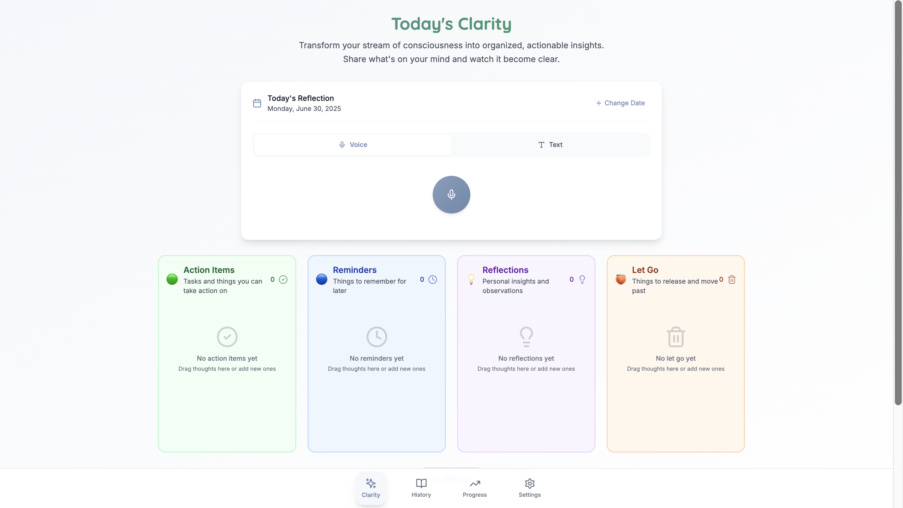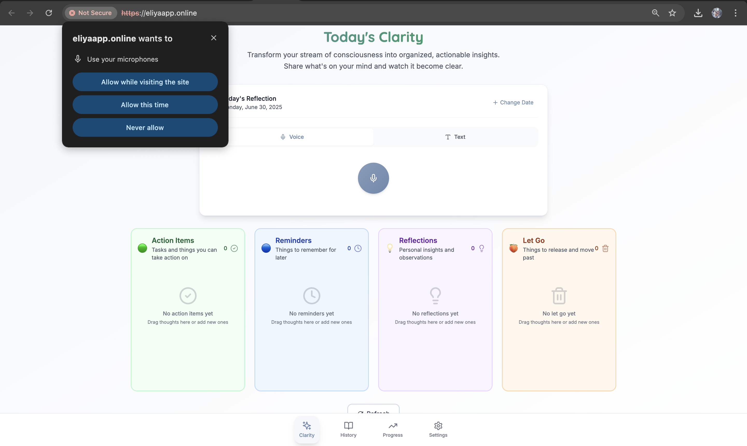 Eliya is a voice-first app. You speak a thought. It transcribes what you said and uses GPT-4 to categorize it as an Action, Reminder, Reflection, or Let Go. That’s all. No advice. Just clarity, without friction.