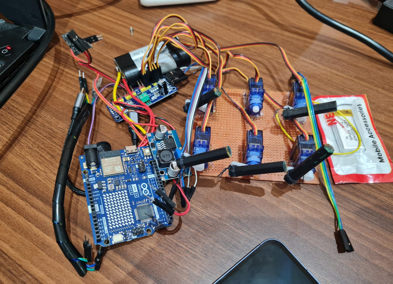 For visually impaired users, we engineered a smart haptic device capable of translating digital information into tactile output. The device integrates seven servo motors, an ESP32 microcontroller, motor drivers, three touch sensors for interaction, and an onboard speaker for multimodal feedback.