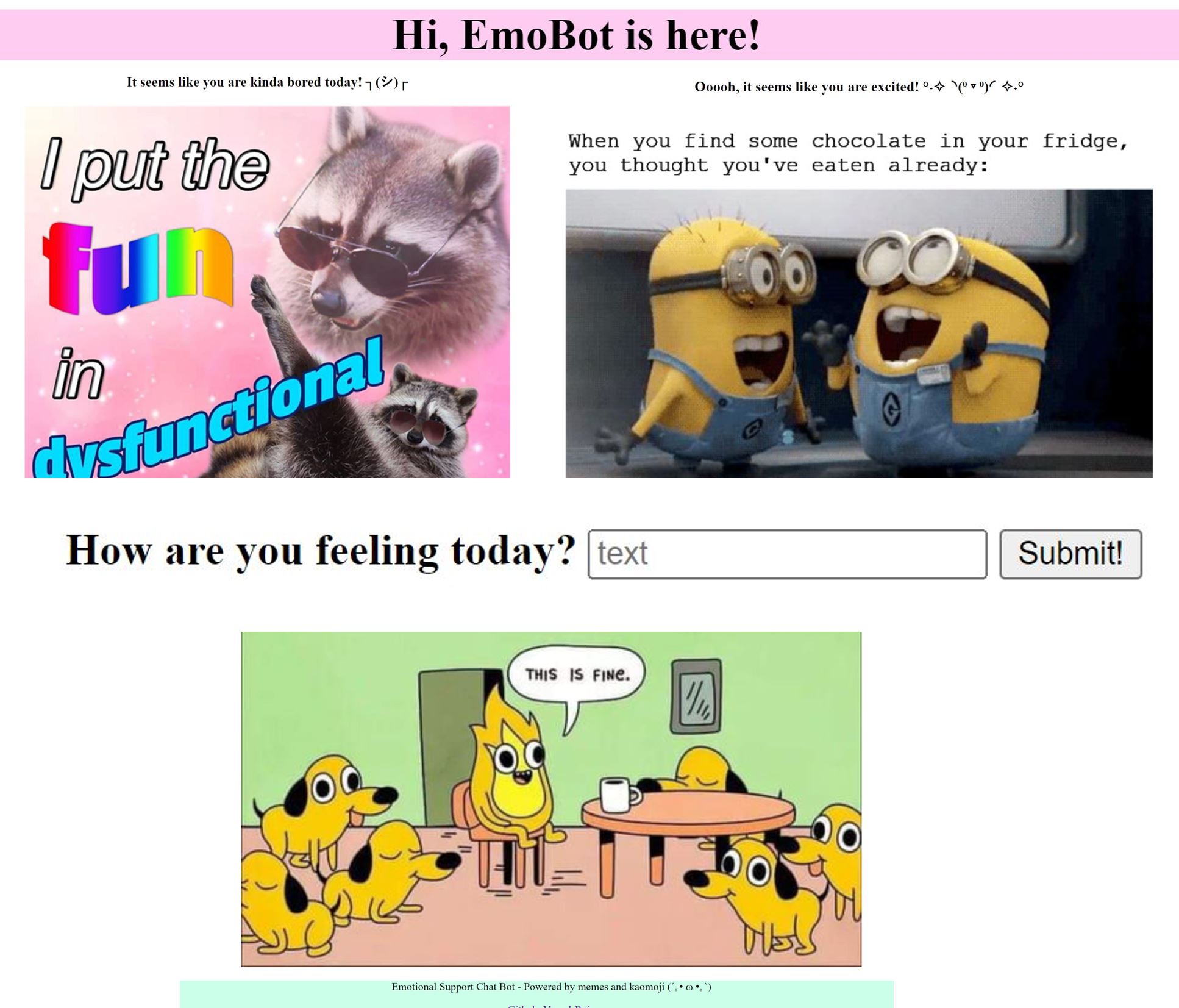 Hi! This is EmoBot, an emotional support chat bot where you can tell it how you're feeling, and it will respond with a fun meme for a wide range of emotions! It does this by detecting key words in your response and ranking them on a scale to determine the main emotion in order to respond appropriately.