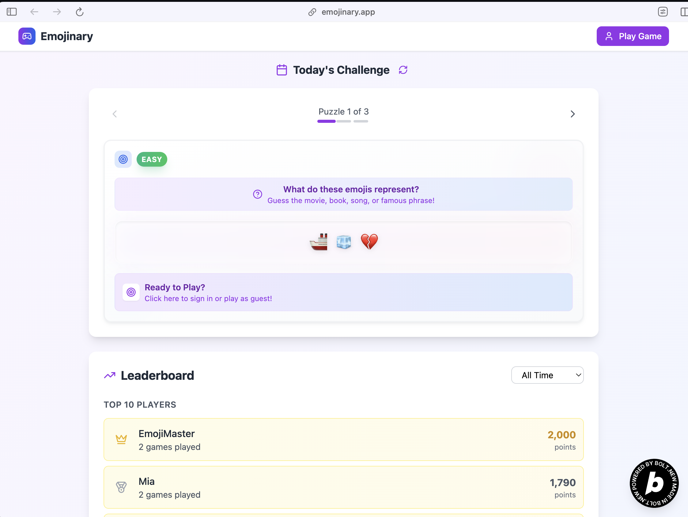 Emojinary (Emoji + Pictionary) was a game idea I had for several years but couldn’t build due to lack of time—until I discovered Bolt. I tested the game idea using phones and simple writing tools and saw a lot of potential and now I have brought my game to life by prompting my out of it.