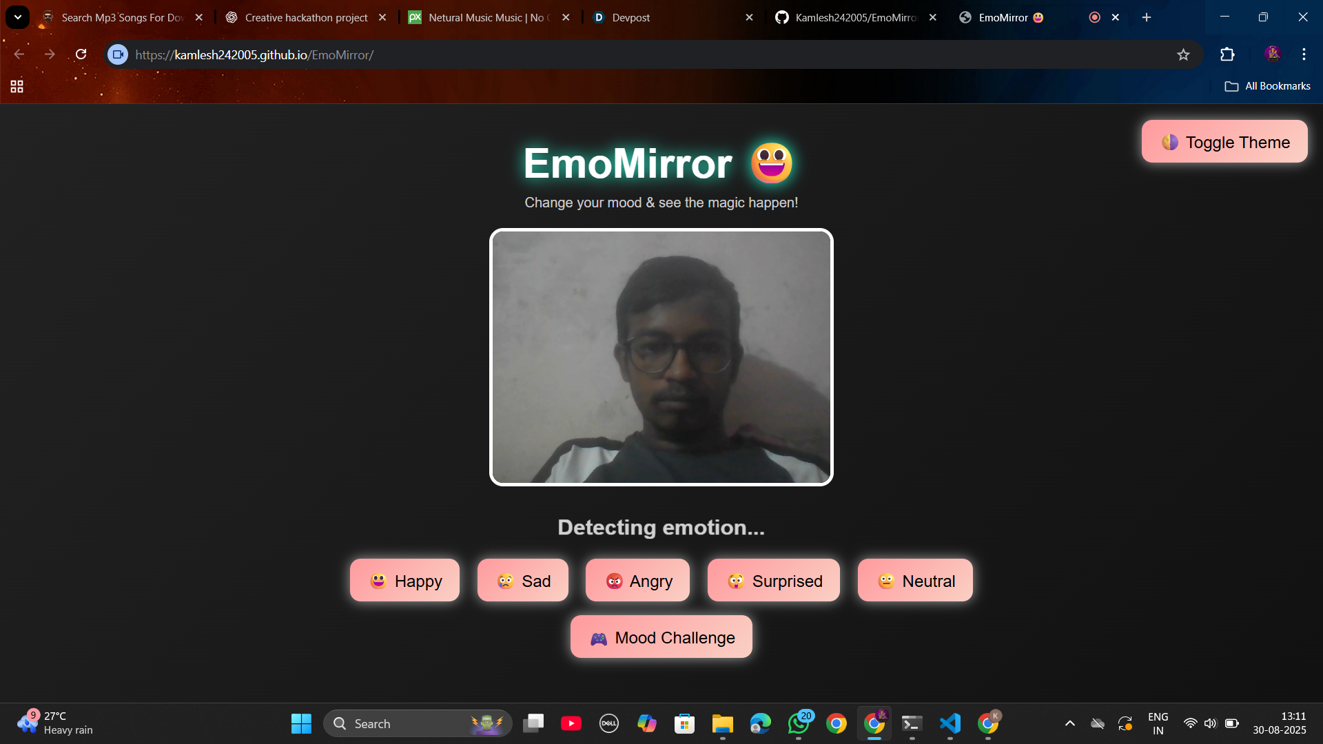 What I learned -The power of frontend technologies (HTML, CSS, JS) in building interactive apps -How design choices strongly impact user engagement and mood perception -The importance of simplicity in delivering a creative hackathon project