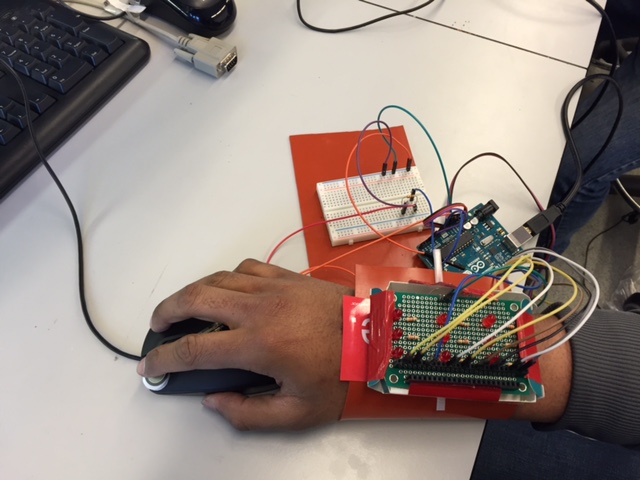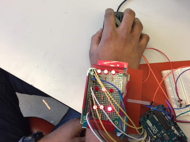 The wearable device is build on arduino uno board, that acquires the raw signal data from the pulse sensor and commands the working of the LED based writing assist system by establishing serial communication with controller acting as server and Matlab the client. For pulse sensor, the raw data acquired from the controller is subjected to signal processing to remove unwanted noise signal. This processed signal is further subjected to feature extraction to determine the inter beat interval. A very critical factor in determining emotion state is the heart rate variability (HRV). Power spectral density of the pulse signal is estimated and from this we calculate the ratio of high frequency and lower frequency component to determine HRV. In our current implementation only a single level of classification is employed where we determine if the user is either happy or stressed (HRV<1 is considered happy). To achieve more accuracy in predicting different levels of emotion, we need to acquire more data sets from children with autism, it can be then trained and classified. The interactive game is developed to make the autistic child aware of routine social interactions and help build a positive mindset towards it. The console is built over a an ATMega32u4 controller running Arduino Leonardo firmware. It uses Human Interface Device (HID) protocol to communicate with the computer, and replicates the behavior of keyboard keys, mouse clicks etc. A simple game to prove the concept is built on a popular online software "Scratch".