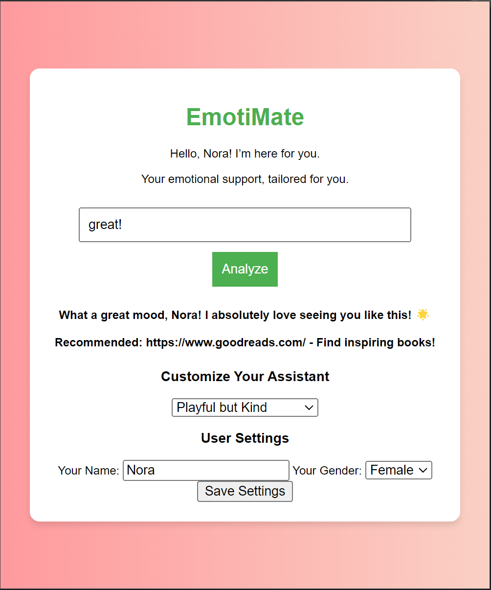 The inspiration for EmotiMate stemmed from the increasing demand for emotional well-being in the digital age. With the rise of remote work and online interaction, many people face feelings of isolation, stress, or a lack of motivation. I wanted to create a tool that not only addressed these issues but also provided a personal touch to enhance user experiences.