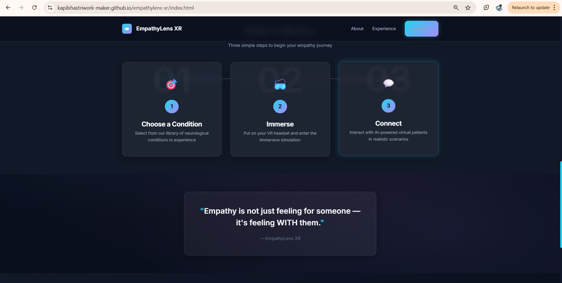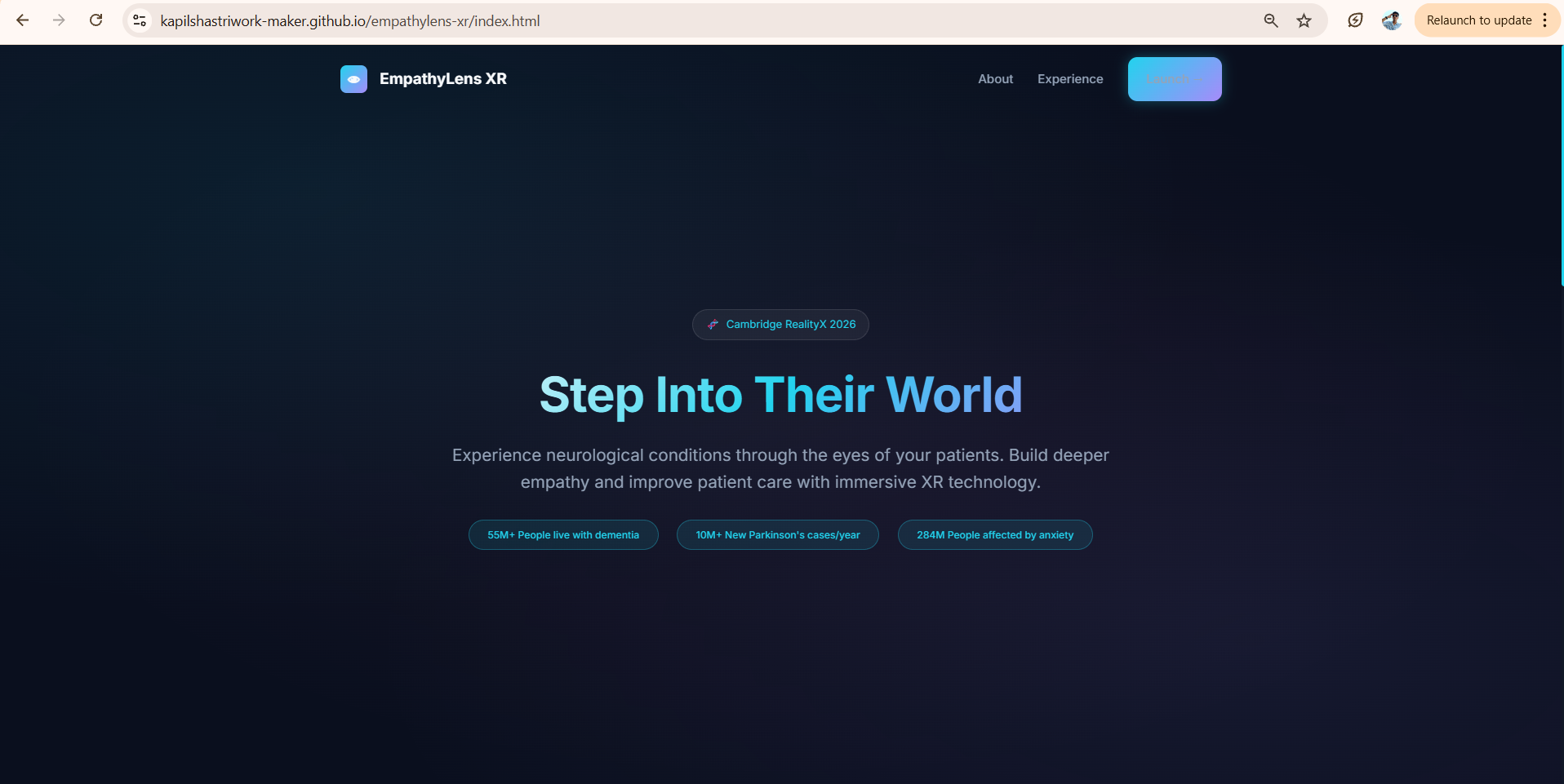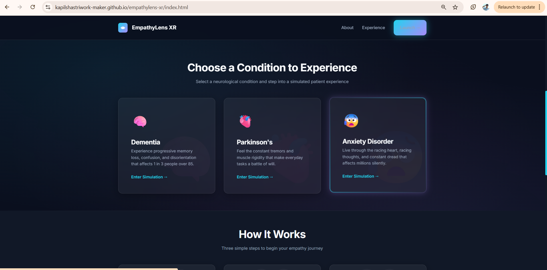 EmpathyLens XR is an immersive WebXR experience that simulates neurological conditions from the patient's point of view. Users are placed inside a 3D hospital room and experience condition-specific visual and audio effects — memory flash overlays and disorientation for dementia, continuous screen tremors for Parkinson's, and a rising BPM counter with pulsing heartbeat for anxiety disorder. Each simulation also features an AI-powered patient (Margaret, Robert, or Sarah) that users can have real conversations with, responding in character using Groq's LLaMA 3.1.