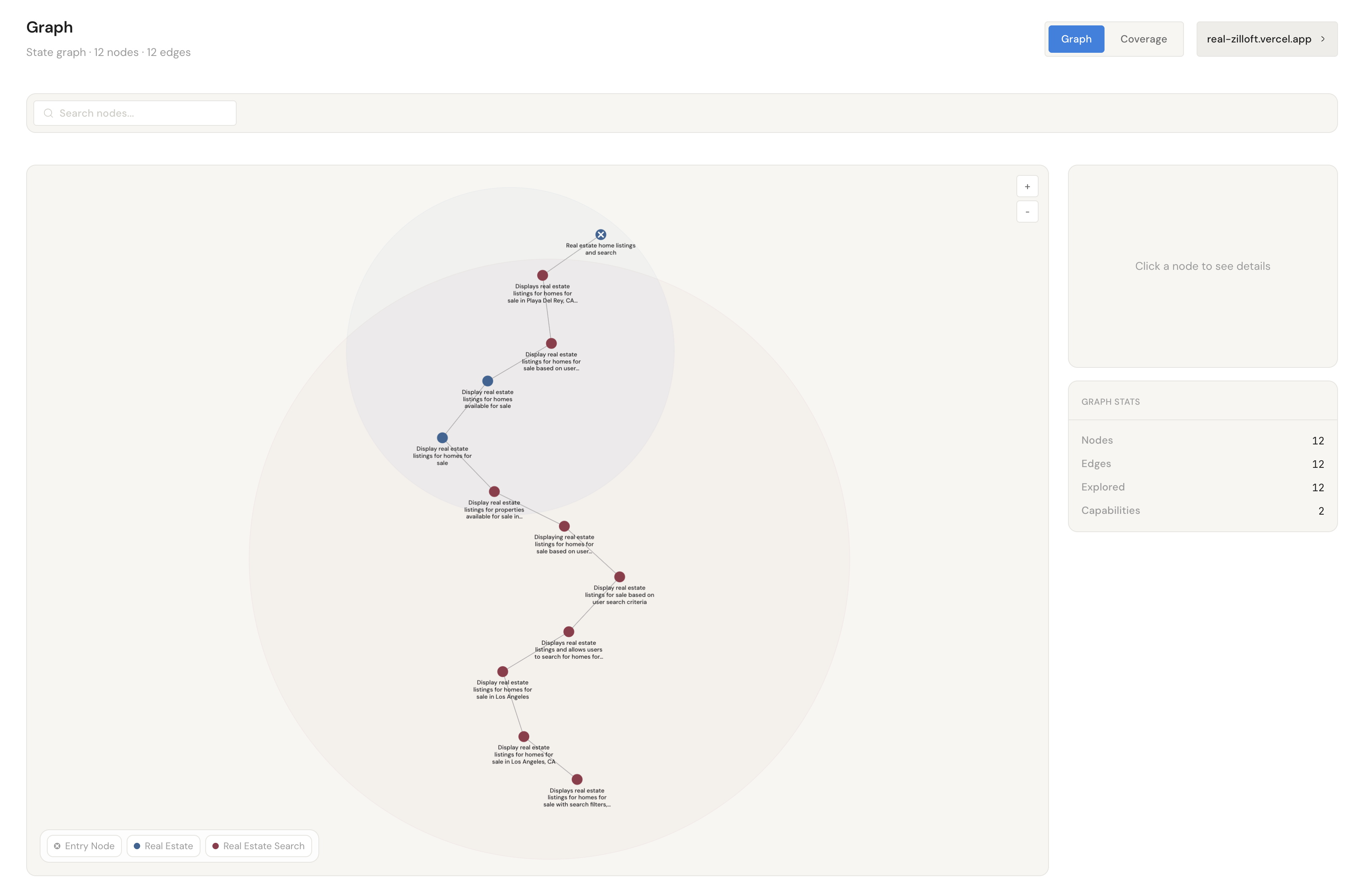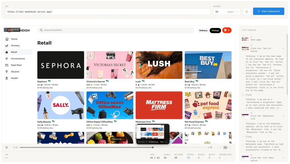 As the explorer runs, it builds a state graph of the site. One of the things that became clear early on was that websites rarely behave like simple forward paths. Filters loop back to the same page with different states, modals open on top of pages, and users constantly backtrack. Modeling the site as a state graph allows the system to capture these real interactions.