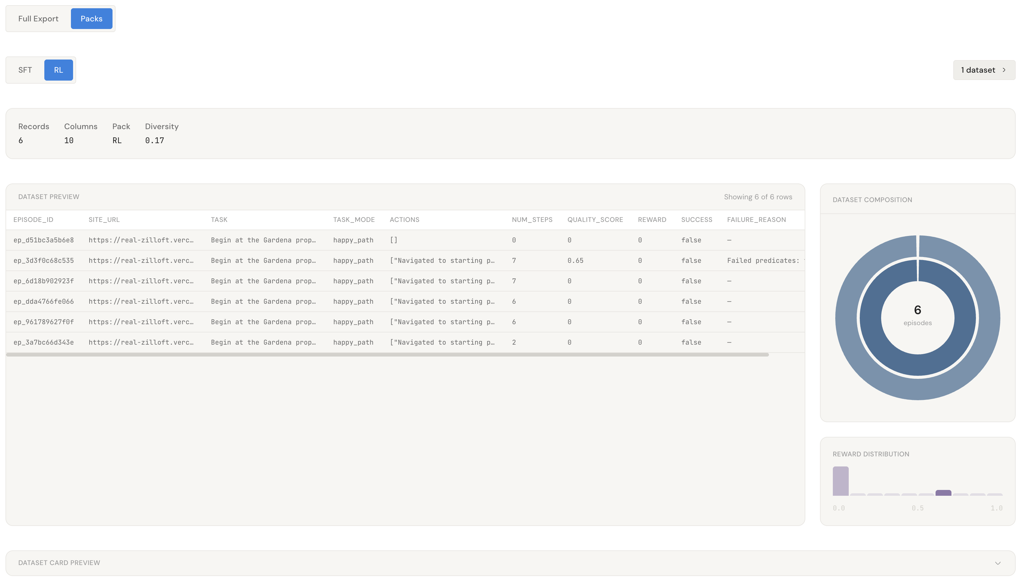 Successful trajectories are exported as dataset packs containing execution traces, screenshots, verification metadata, and quality scores. These can be used for training, evaluation, or RL experiments with browser agents.