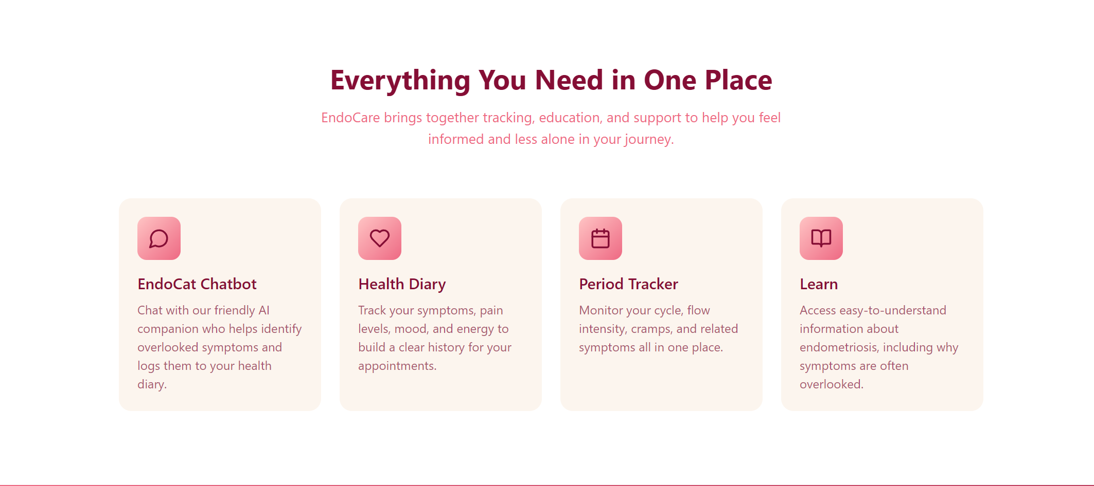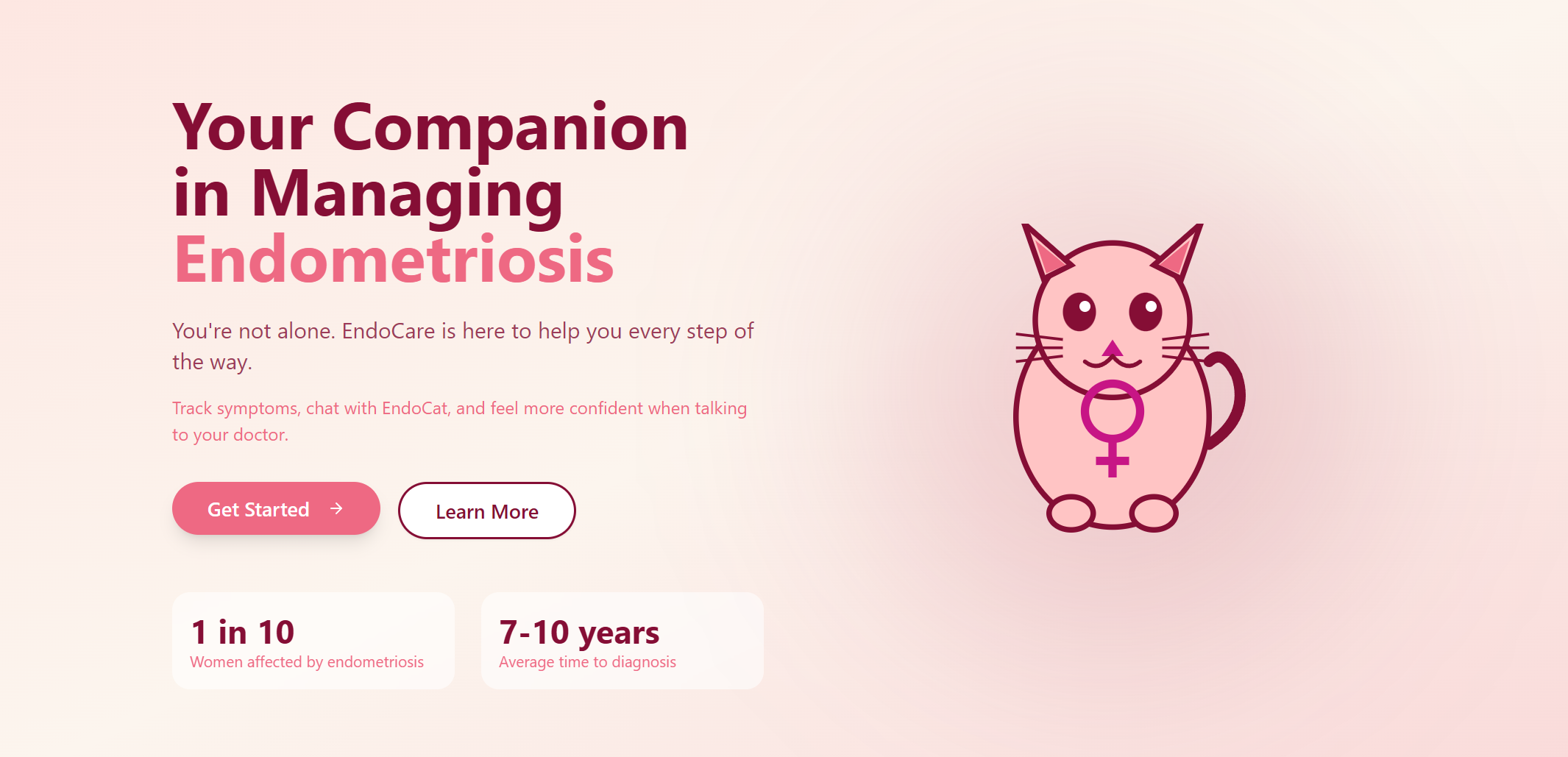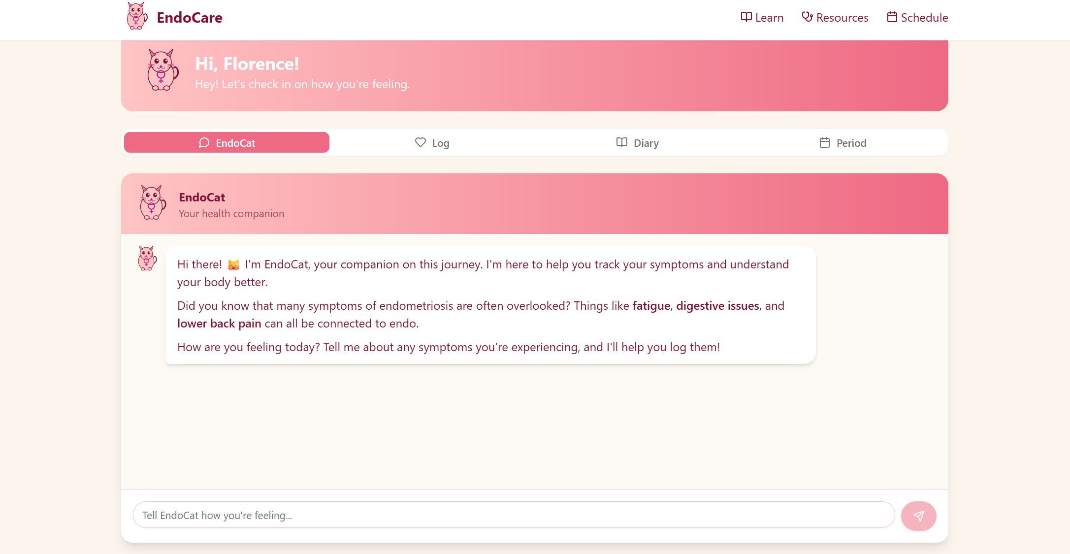 The main focus of our app is to connect users with real specialists if they show signs of endometriosis. The app allows the user to log their symptoms in a health diary, learn more about endometriosis, and chat with EndoCat, an AI chatbot that can help navigate their symptoms.