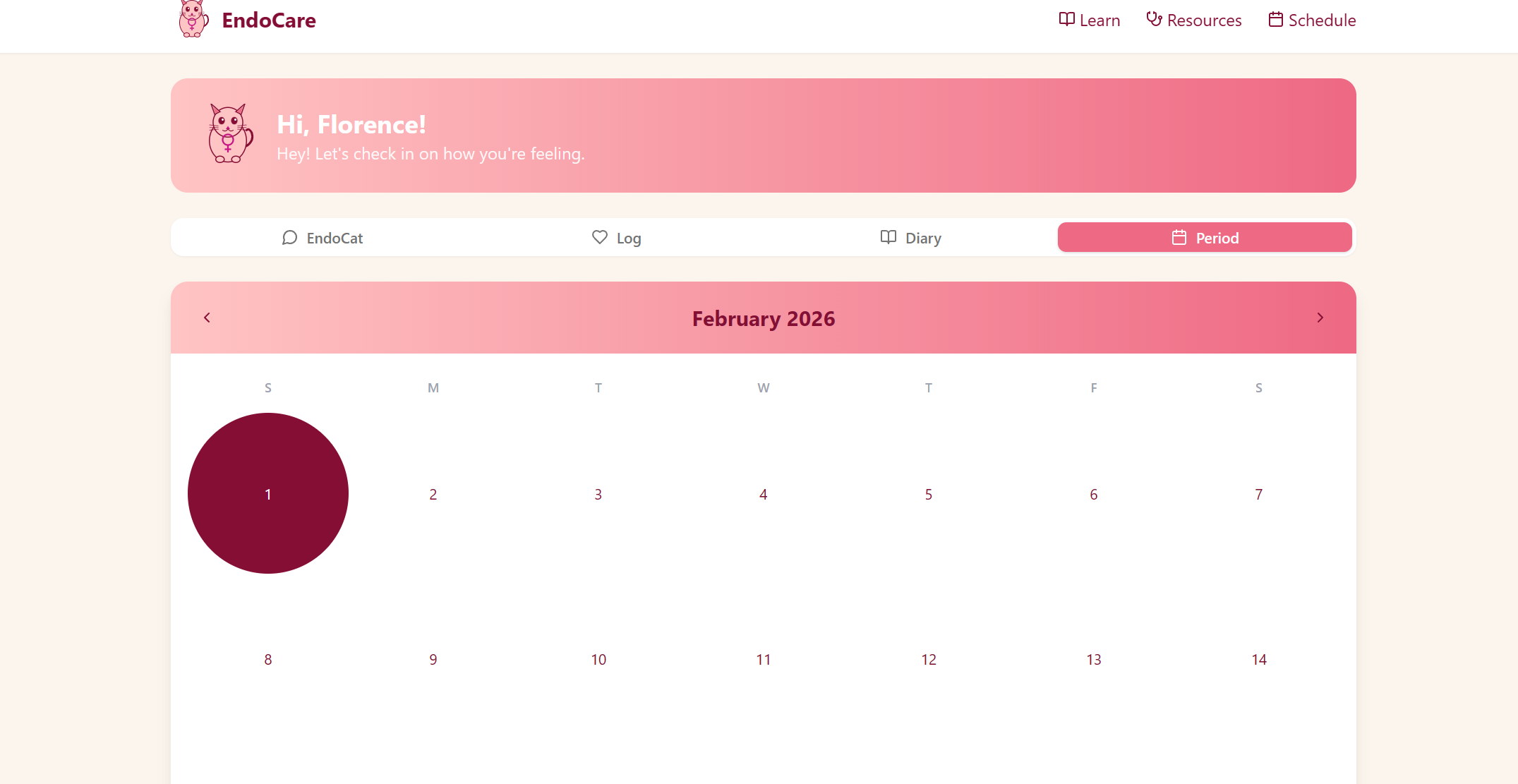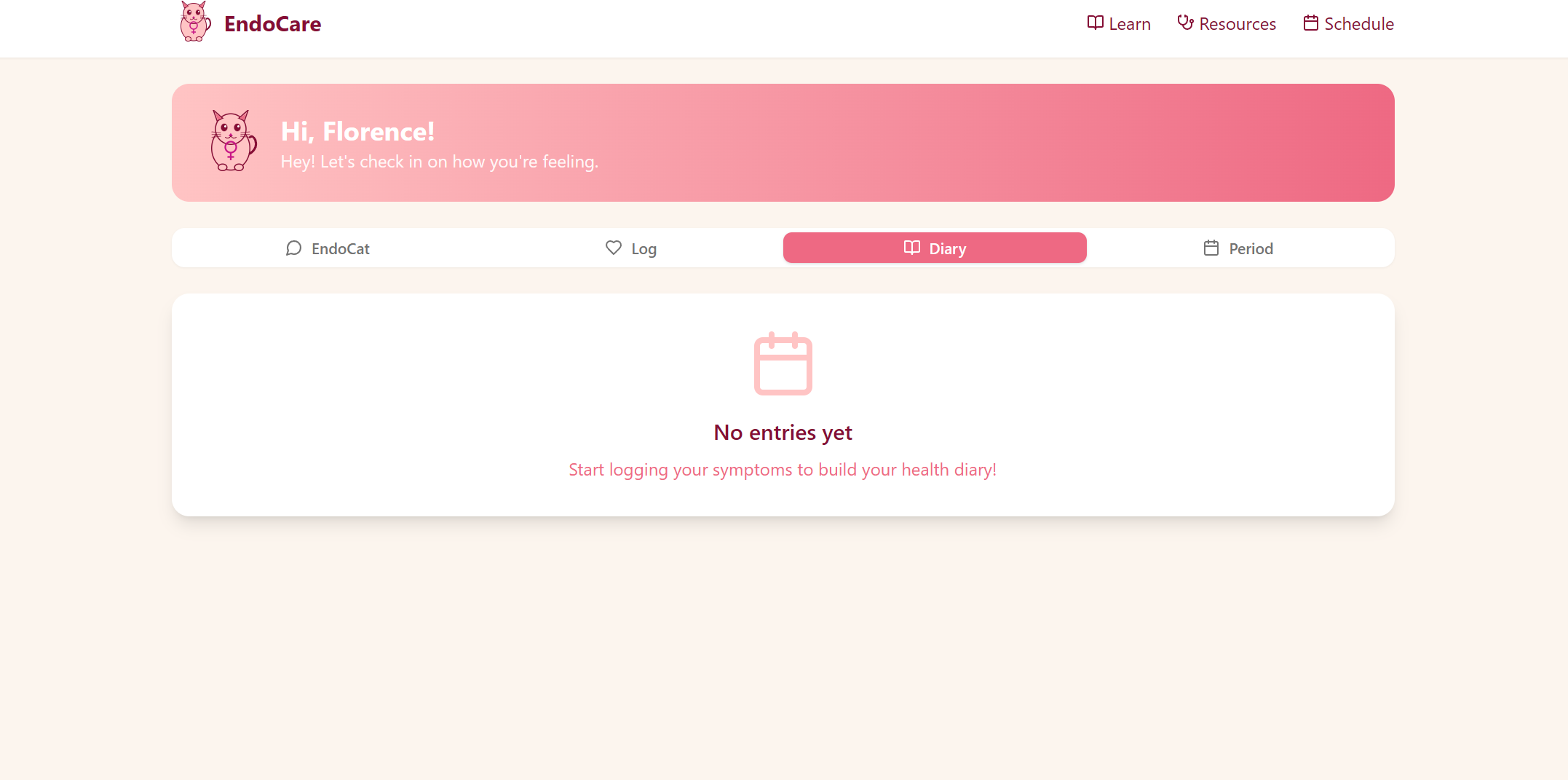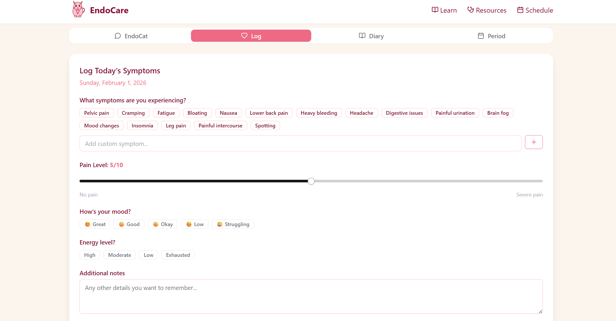 The main focus of our app is to connect users with real specialists if they show signs of endometriosis. The app allows the user to log their symptoms in a health diary, learn more about endometriosis, and chat with EndoCat, an AI chatbot that can help navigate their symptoms.