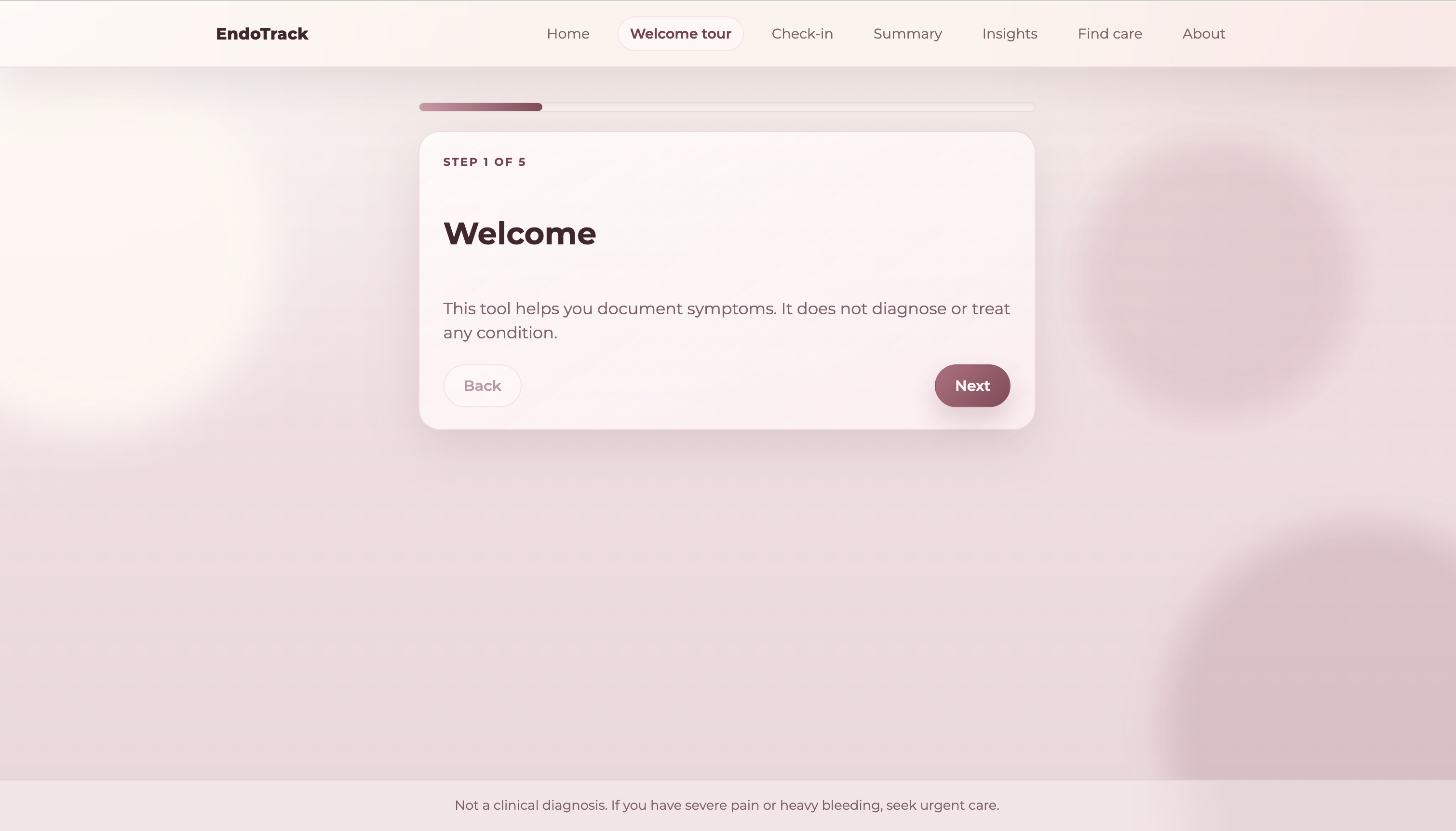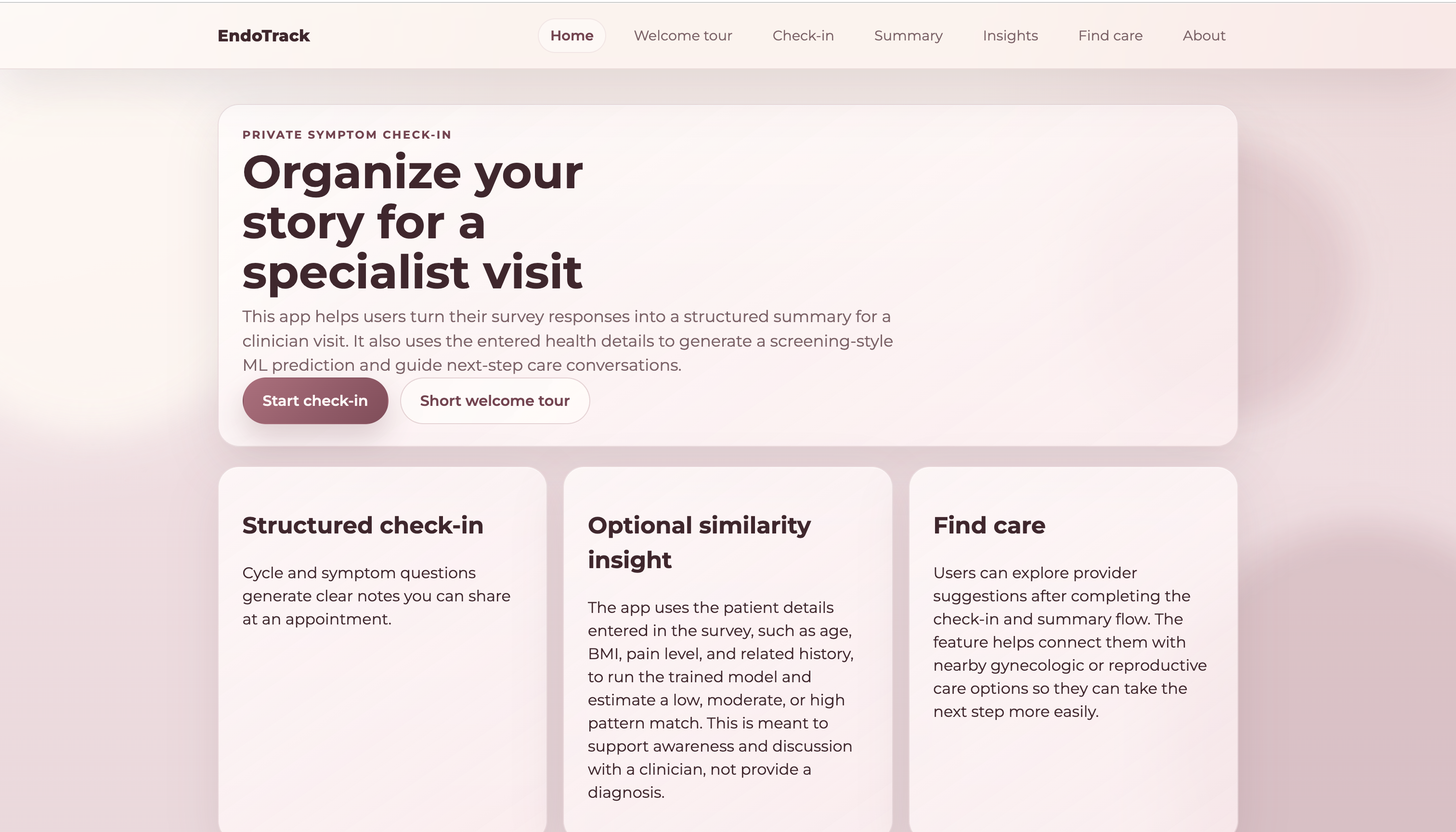 EndoTrack was inspired by how long and frustrating the endometriosis journey can be for people trying to describe symptoms clearly to a clinician. The idea was to create a supportive tool that helps users organize their experiences, turn them into shareable visit notes, and make it easier to know when a specialist referral may be warranted.