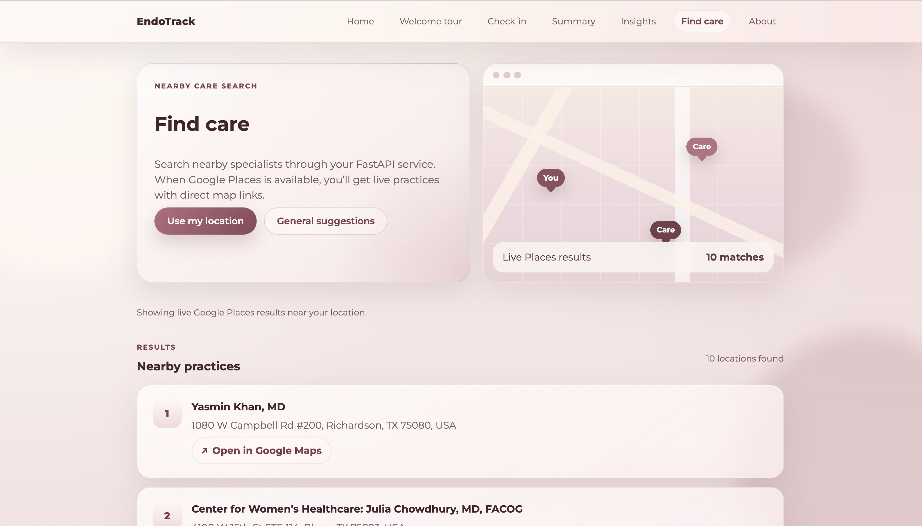 One challenge we ran into was aligning the user-facing check-in questions with the actual ML dataset. At first, the survey questions were more general symptom questions, but the model required very specific structured inputs like age, BMI, chronic pain level, menstrual irregularity, hormone abnormality, and infertility. We had to redesign the check-in so the frontend and backend matched the model’s training data. We also ran into API integration issues with Google Places.