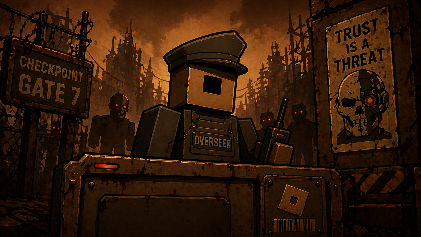 Overseer.exe is set in 2031, after a cyborg infection has overrun Earth and most cities have gone dark. The player serves as the last Overseer at Checkpoint 7, a fortified survivor stronghold at the edge of the wasteland. Refugees arrive seeking shelter, but so do infected cyborgs wearing human faces, replicas with mismatched memories, and bad actors attempting to infiltrate the base (Checkpoint 7). The player's job is to inspect each visitor and decide who gets through.