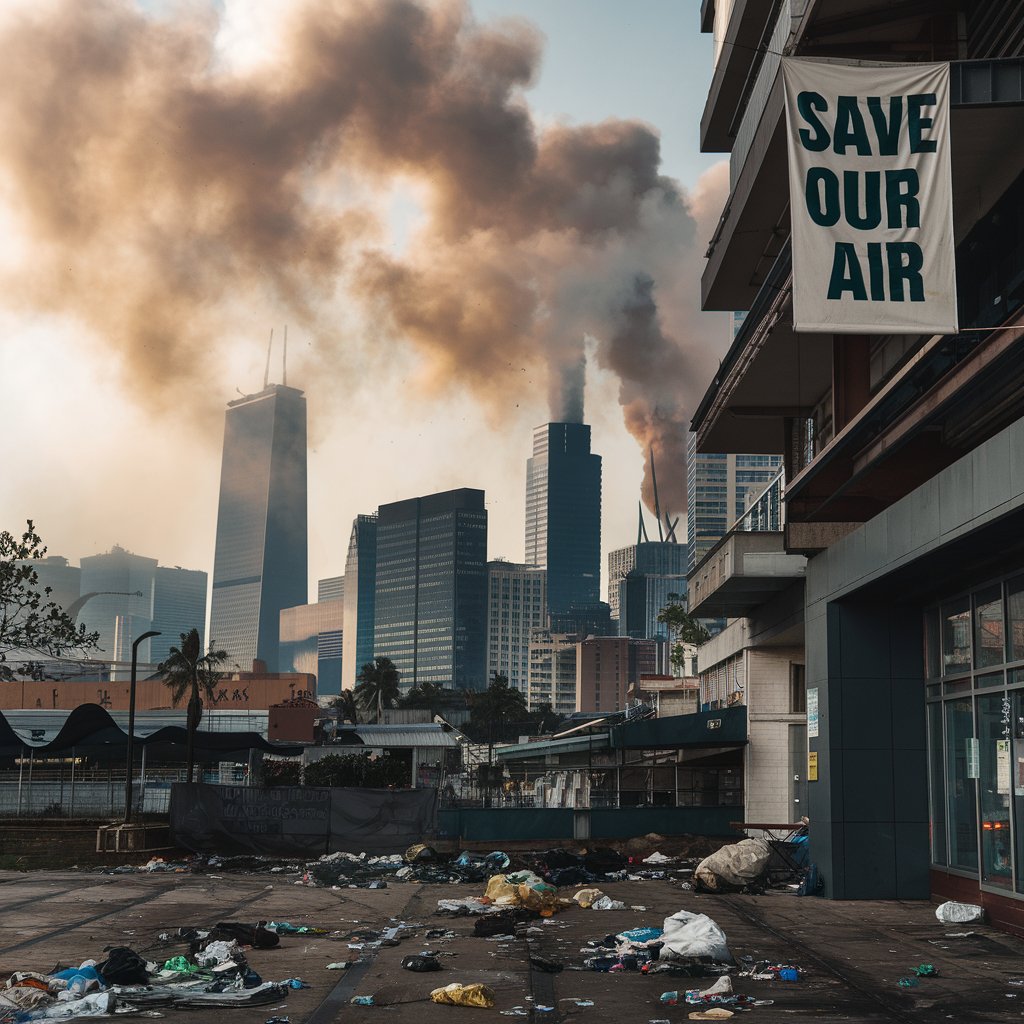 A photo of a city skyline with smog and pollution. The sky is filled with smoke and the buildings are partially visible. The ground is covered with litter. There is a banner hanging from a building that says "Save Our Air". The atmosphere is somber.