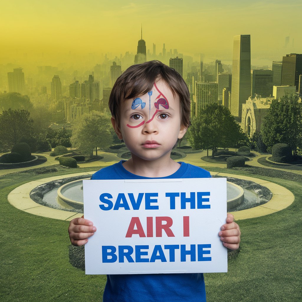 A photo of a young child with respiratory issues holding a sign that says "Save the air I breathe". The background is a city with a yellow smog over the buildings. The foreground is a clean environment, with grass, trees, and a fountain. The overall image has a message of awareness about air pollution and its impact on vulnerable populations.