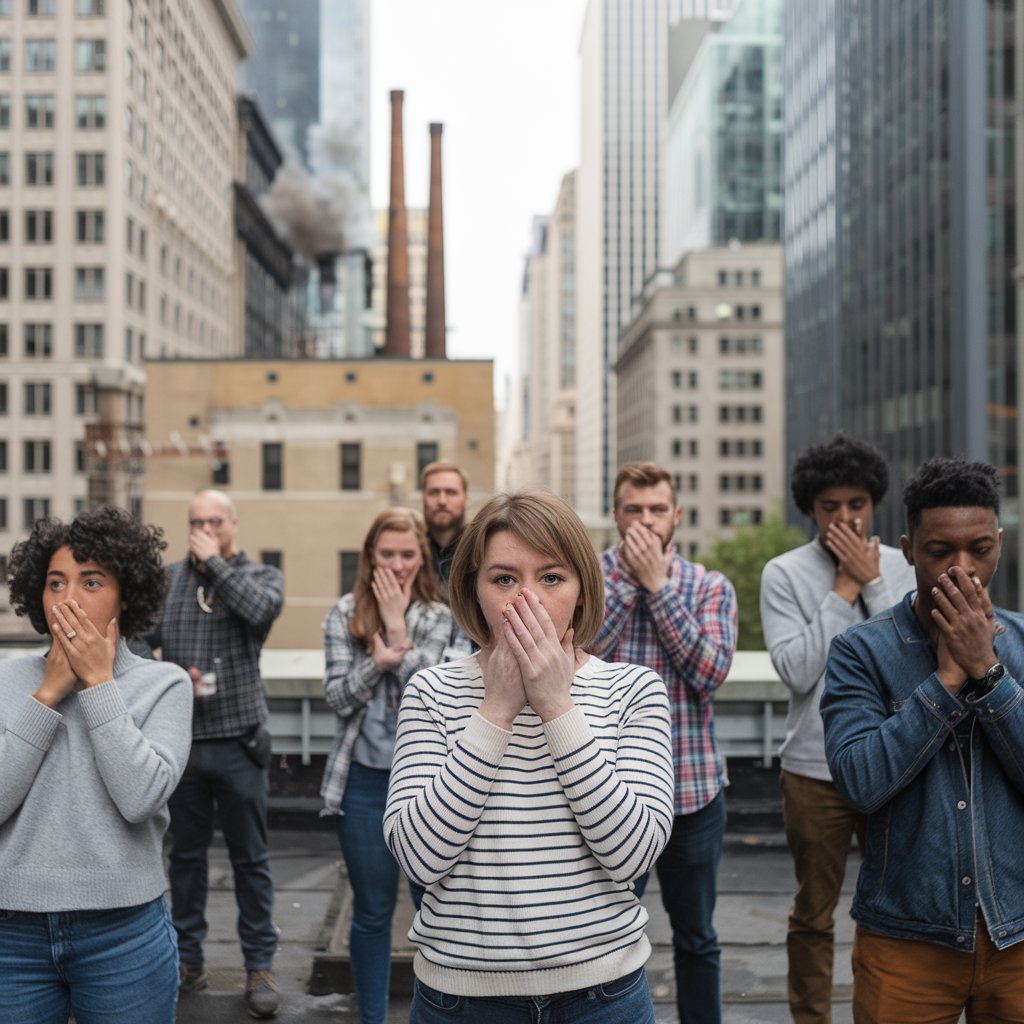 A photo of a diverse group of people standing on a rooftop in a US city. The background contains tall buildings with smoke coming out of the chimneys. The foreground contains the people holding their hands over their mouths and noses. The overall image is blurred.