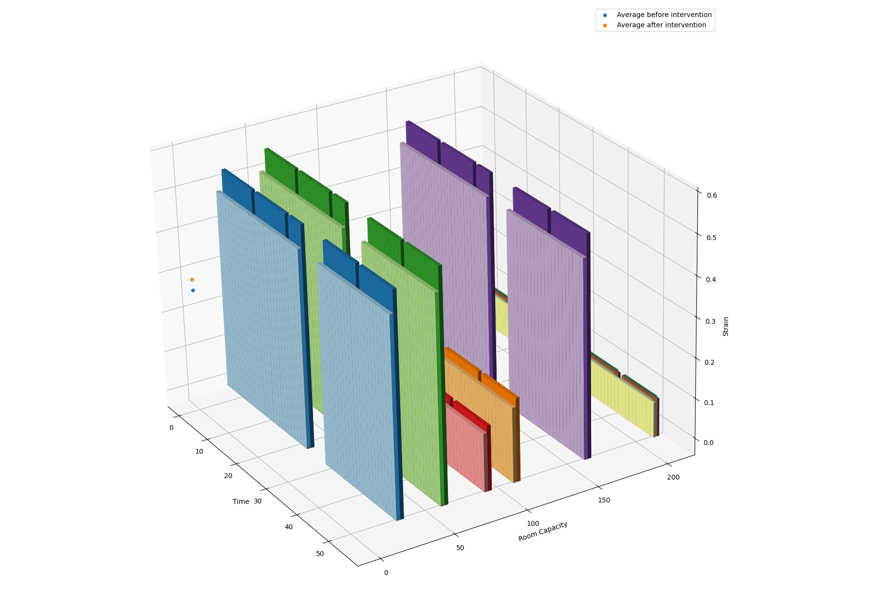 To compute strain we find consecutive runs of \((\mathbf q_1, \dots, \mathbf q_i, \mathbf p_1, \dots, \mathbf p_j)\). Strain is just \(\frac{i}{j}\). If strain is ever \(\gt 1\), we carry the leftover events into the next bunch of rooms. It's a nice explainable number while also being useful for modelling new buildings.
