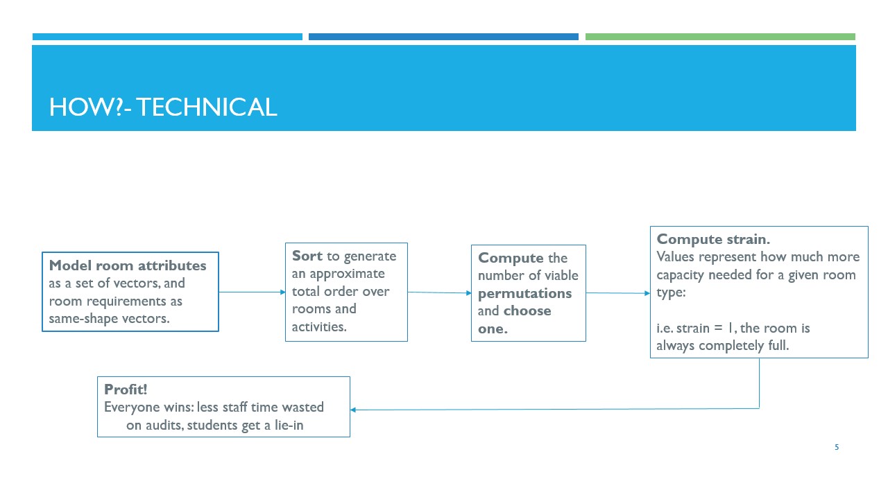 Practically, we model room attributes as set of vectors \(\{\mathbf P\}\) and room requirements as same-shape vectors \(\{\mathbf Q\}\). We sort them together in lexicographic order and generate an approximate total order over rooms and timetabled activities. Next, we compute the number of viable permutations based on the total order. We also compute strain based on simulated optimal allocation. The actual strain values represent how much more capacity we need for a given room type: strain of 1 means the room is always completely full.