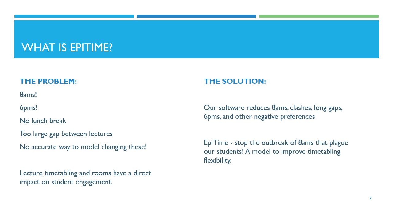 Epitime lies at the intersection of physics, biology and computer science. We model the entropy of lecture rooms, using epidemiological methods to discover the most effective interventions that could improve timetable flexibility.