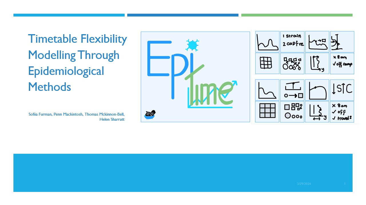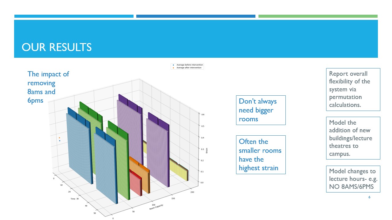 Epitime provides a live model of timetable strain. This is a technical term used in epidemiological modelling to describe the \(95^{\text{th}}\) percentile of location occupancy (and therefore transmission). We use this metric to figure out how much flexibility we get added from each room in the timetable. Users can load an existing timetable or use our models to build dummy data. They then suggest changes to room availability, such as banning 8ams and seeing which rooms are too full, or suggesting repurposing an existing room for lectures and seeing what improves. Our data-driven model responds instantly with a visualization of the exact impact.