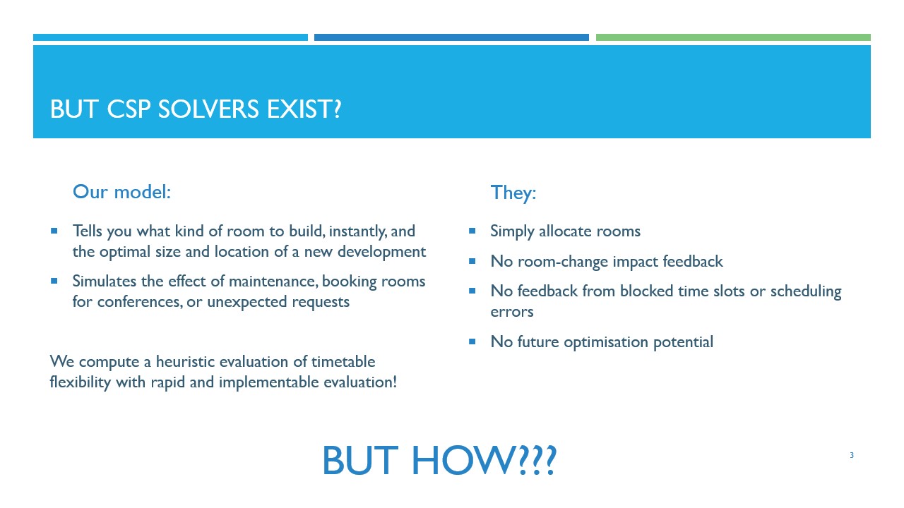 The draft timetable produced by Epitime can be fed into a CSP solver to produce higher-quality timetables. Our drafts are viable apart from overlapping groups, which can easily be solved by hill-climbing. As well as being easy to produce a viable timetable from them, our drafts are optimal - something that is very hard to achieve with a CSP solver! This means that we guarantee everyone is put in the smallest suitable room, leaving much more flexibility for other events.