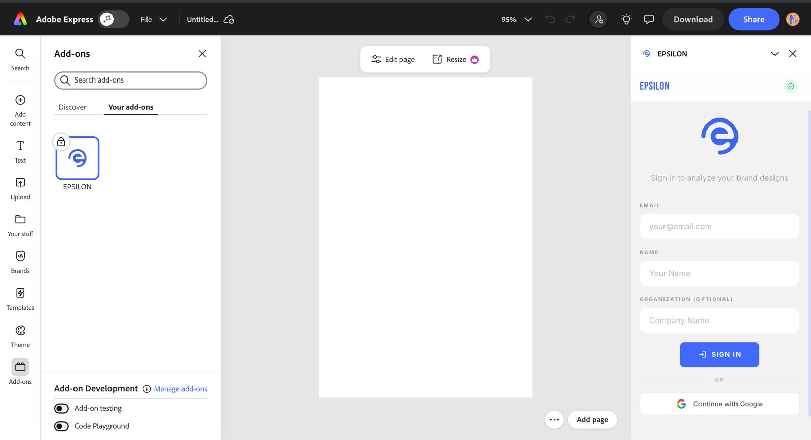 The **Adobe Express add-on** is where designers interact with EPSILON. It reads basic design information like fonts and colors from the canvas and sends that data to the backend.