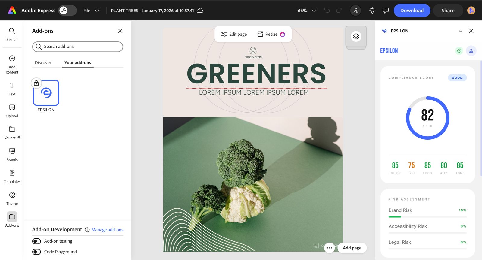 First, it checks whether a design actually follows a given brand kit. It looks at colors, fonts, logos, and accessibility rules, then generates a compliance score. Instead of just saying something is wrong, it explains *what* the issue is and *why* it matters. For premium users, EPSILON can also fix common issues directly inside Adobe Express.