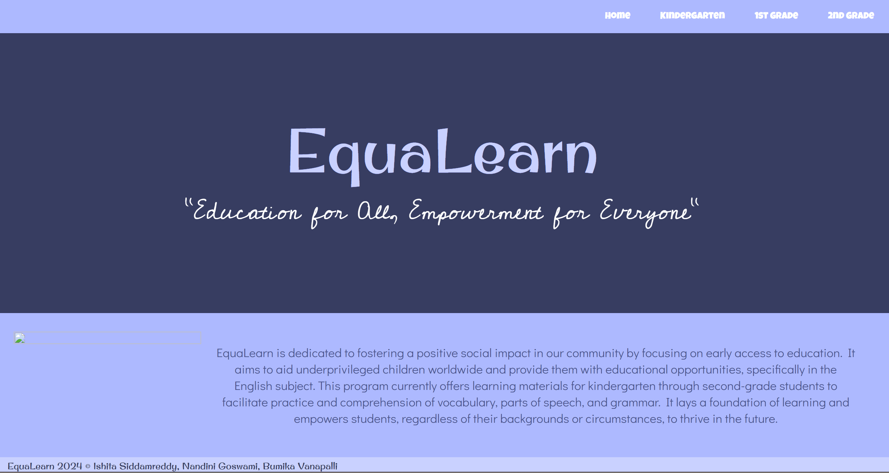 Education has been a primary driving source for most of our lives. The support we have gotten in our communities to further our education motivated us to always give back to the community in need. Throughout high school we worked with numerous organizations such as Kumon, PREPARE nonprofit, Discovery Place etc that provided supplemental education to interested students. EquaLearn was a way to compile resources into a single website for kids to play around on and learn from to further their education and prepare for the future.