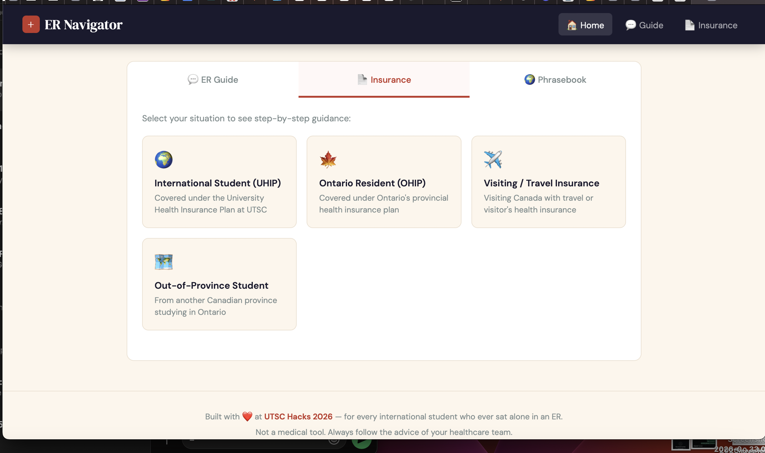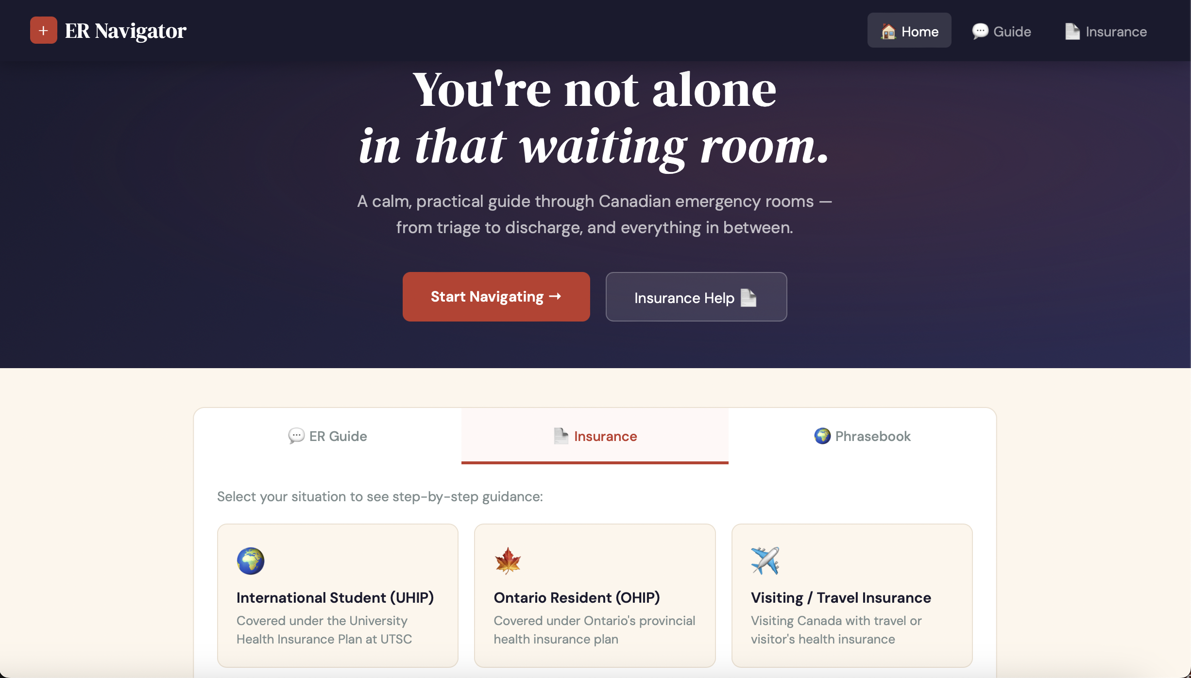 I'm a premed international student at UTSC. I tore my ACL and spent 13 hours alone in a Montreal ER. I didn't understand triage, I didn't know my rights, and I had no idea how to file a UHIP claim afterward. I was scared, in pain, and completely lost. No one should feel that way — so I built ER Navigator.
