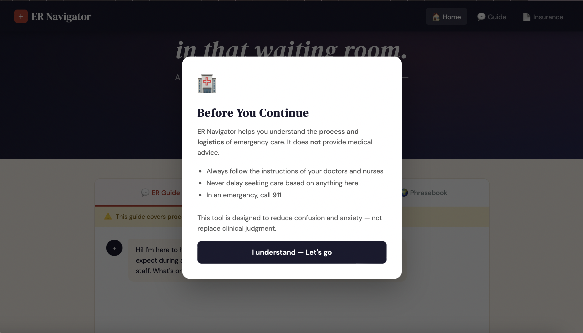 - ER Guide — AI chat that explains triage, wait times, and patient rights. Never medical advice — always redirects clinical questions to the care team.