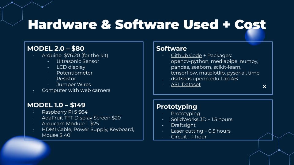 We trained a model through NN and CNN for hand detection and hand landmark placements, then FCNN for classification. Using libraries such as opencv-python, mediapipe, numpy, etcs, we were able to use device webcam to open a live video stream and capture images of hand gestures. The classification is then sent to Arduino through the library pyserial enabling communication between the model and Arduino codes. The classification is then displayed on an LCD screen. An additional ultrasonic sensor detected when to open the camera to look for gestures. It acts as the cue to show the next gesture.